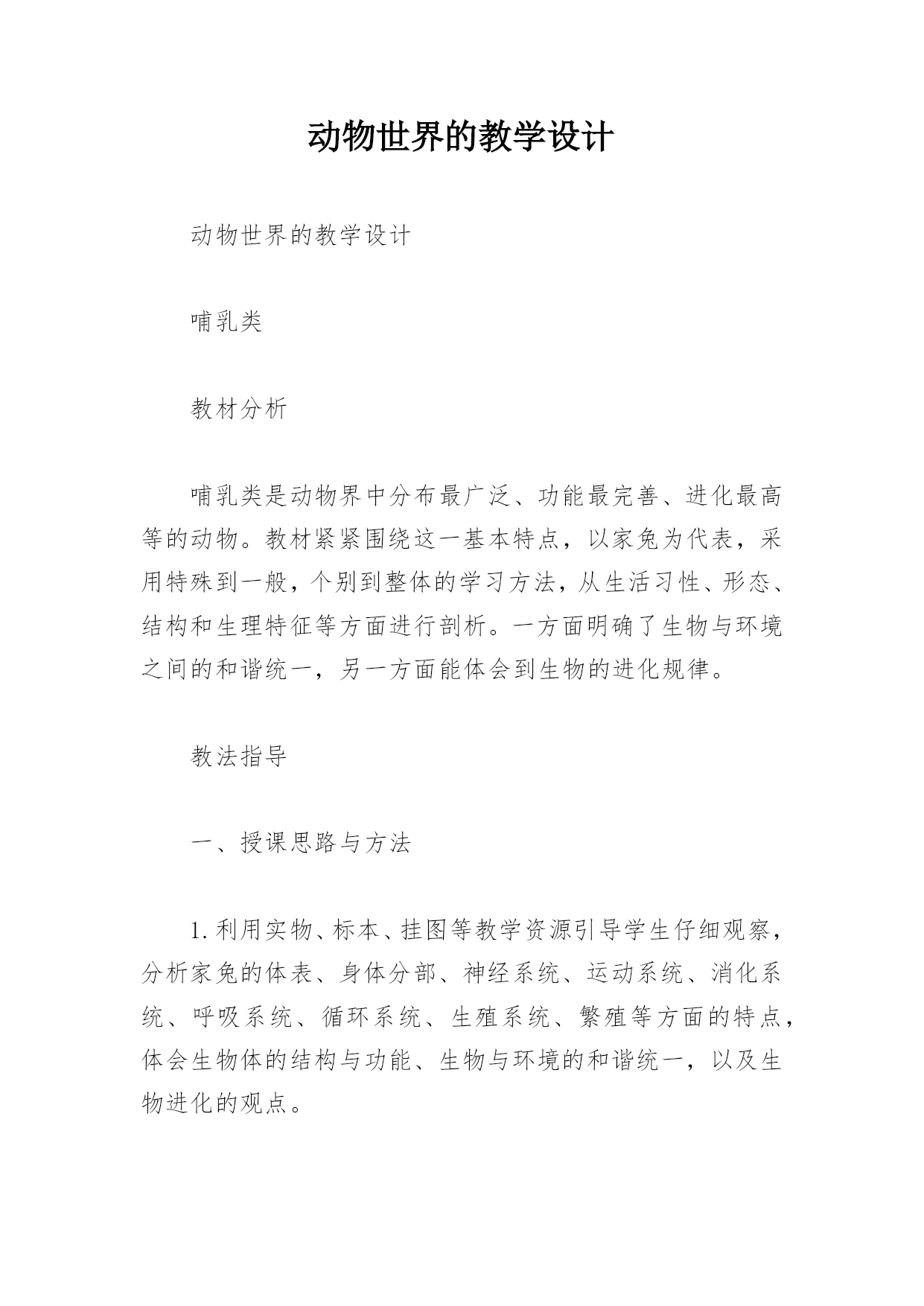动物世界的教学设计动物世界的教学设计哺乳类教材分析哺乳类是动物界中分布最广泛、功能最完善、进化最高等的动物。教材紧紧围绕这一基本特点,以家兔为代表,采用特殊到一般,个别到整体的学习方法,从生活习性、形态、结构和生理特征等方面进行剖析。一方面明确了生物与环境之间的和谐统一,另一方面能体会到生物的进化规律。教法指导一、授课思路与方法1.利用实物、标本、挂图等教学资源引导学生仔细观察,分析家兔的体表、身体分部、神经系统、运动系统、消化系统、呼吸系统、循环系统、生殖系统、繁殖等方面的特点,体会生物体的结构与功能、