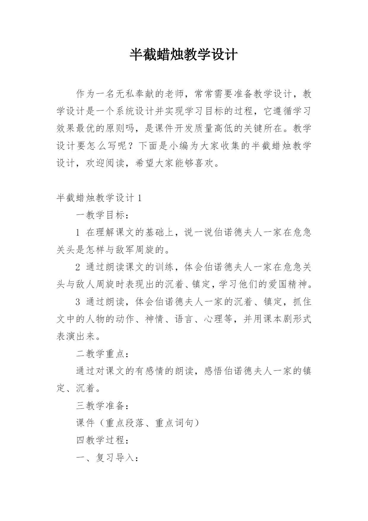 半截蜡烛教学设计作为一名无私奉献的老师,常常需要准备教学设计,教学设计是一个系统设计并实现学习目标的过程,它遵循学习效果最优的原则吗,是课件开发质量高低的关键所在。教学设计要怎么写呢?下面是小编为大家收集的半截蜡烛教学设计,欢迎阅读,希望大家能够喜欢。半截蜡烛教学设计1一教学目标:1在理解课文的基础上,说一说伯诺德夫人一家在危急关头是怎样与敌军周旋的。2通过朗读课文的训练,体会伯诺德夫人一家在危急关头与敌人周旋时表现出的沉着、镇定,学习他们的爱国精神。3通过朗读,体会伯诺德夫人一家的沉着、镇定,抓住文中的