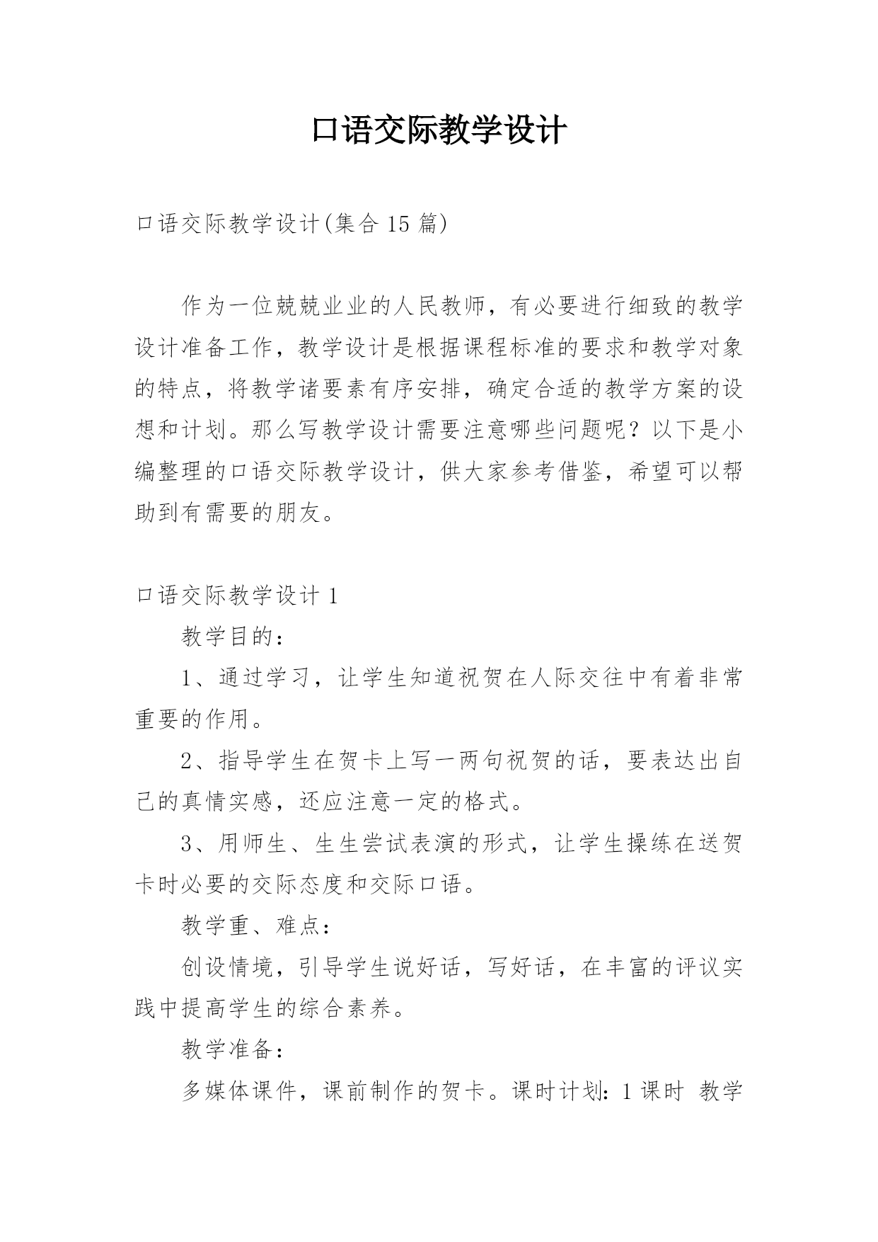 口语交际教学设计口语交际教学设计(集合15篇)作为一位兢兢业业的人民教师,有必要进行细致的教学设计准备工作,教学设计是根据课程标准的要求和教学对象的特点,将教学诸要素有序安排,确定合适的教学方案的设想和计划。那么写教学设计需要注意哪些问题呢?以下是小编整理的口语交际教学设计,供大家参考借鉴,希望可以帮助到有需要的朋友。口语交际教学设计1教学目的:1、通过学习,让学生知道祝贺在人际交往中有着非常重要的作用。2、指导学生在贺卡上写一两句祝贺的话,要表达出自己的真情实感,还应注意一定的格式。3、用师生、生生尝试