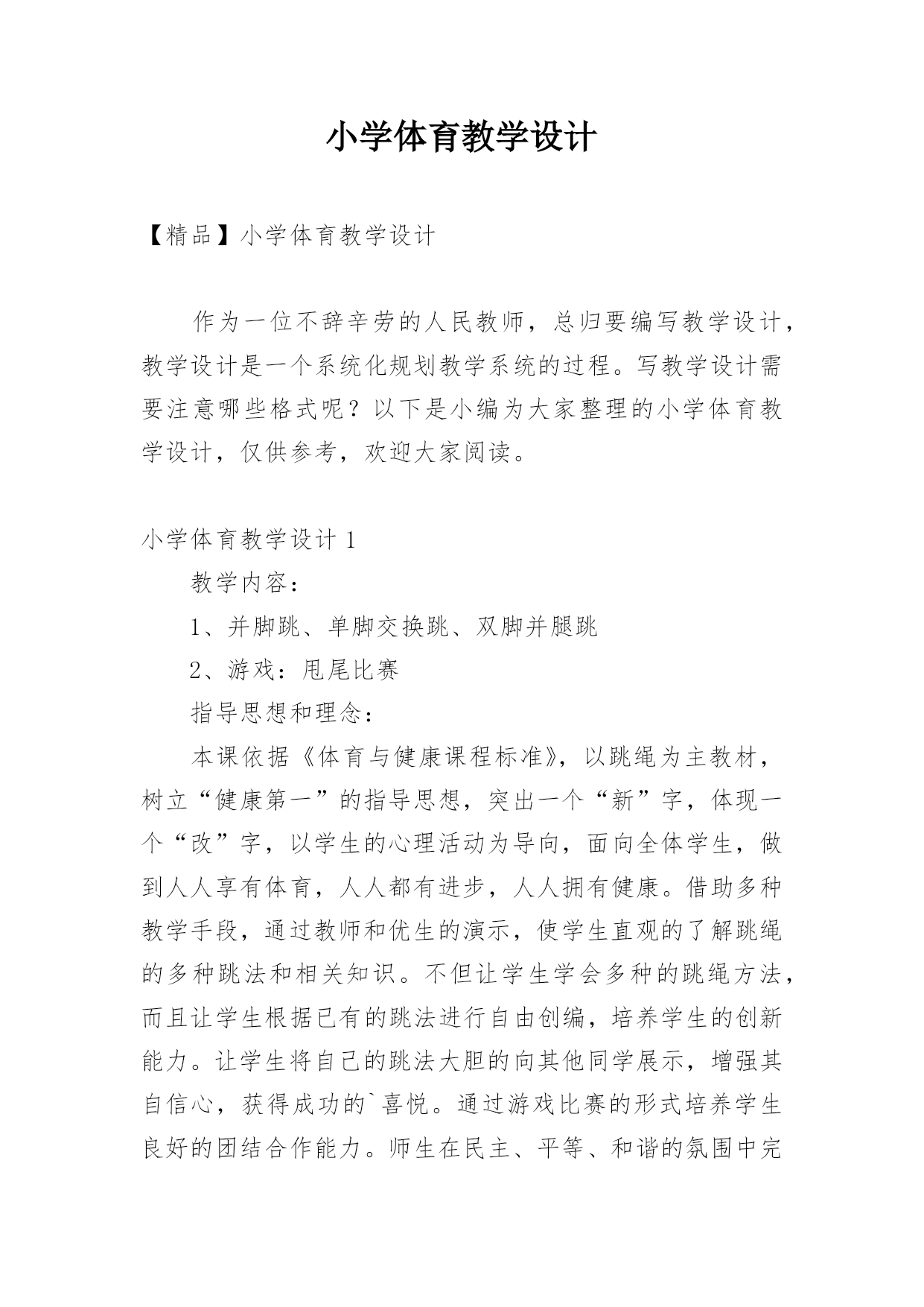 小学体育教学设计【精品】小学体育教学设计作为一位不辞辛劳的人民教师,总归要编写教学设计,教学设计是一个系统化规划教学系统的过程。写教学设计需要注意哪些格式呢?以下是小编为大家整理的小学体育教学设计,仅供参考,欢迎大家阅读。小学体育教学设计1教学内容:1、并脚跳、单脚交换跳、双脚并腿跳2、游戏:甩尾比赛指导思想和理念:本课依据《体育与健康课程标准》,以跳绳为主教材,树立“健康第一”的指导思想,突出一个“新”字,体现一个“改”字,以学生的心理活动为导向,面向全体学生,做到人人享有体育,人人都有进步,人人拥有健