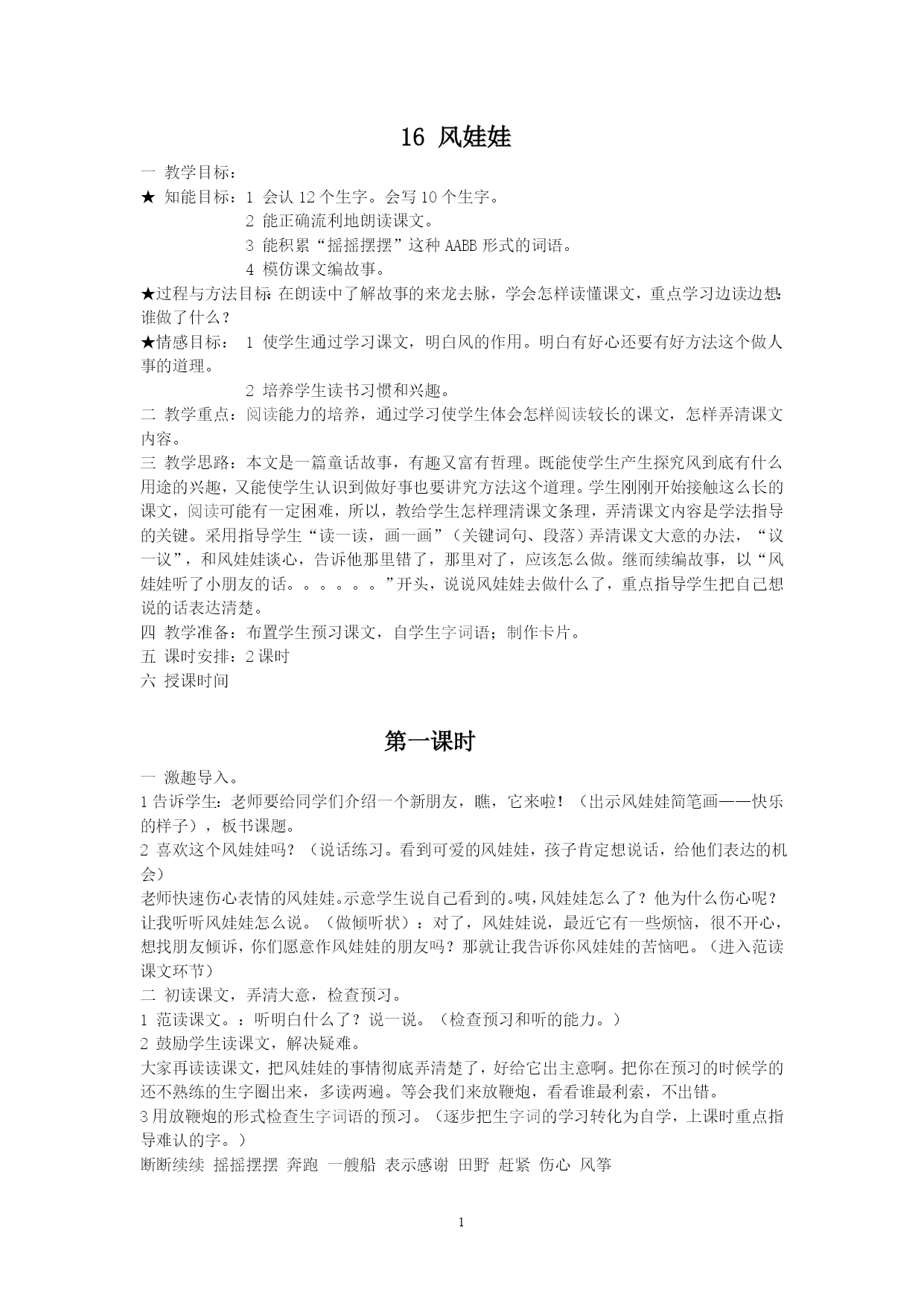 PAGE\*MERGEFORMAT216风娃娃一教学目标:★知能目标:1会认12个生字。会写10个生字。2能正确流利地朗读课文。3能积累“摇摇摆摆”这种AABB形式的词语。4模仿课文编故事。★过程与方法目标:在朗读中了解故事的来龙去脉,学会怎样读懂课文,重点学习边读边想:谁做了什么?★情感目标:1使学生通过学习课文,明白风的作用。明白有好心还要有好方法这个做人事的道理。2培养学生读书习惯和兴趣。二教学重点:HYPERLINK"http://www.teachercn.com/Xxyw/Yd/"\t