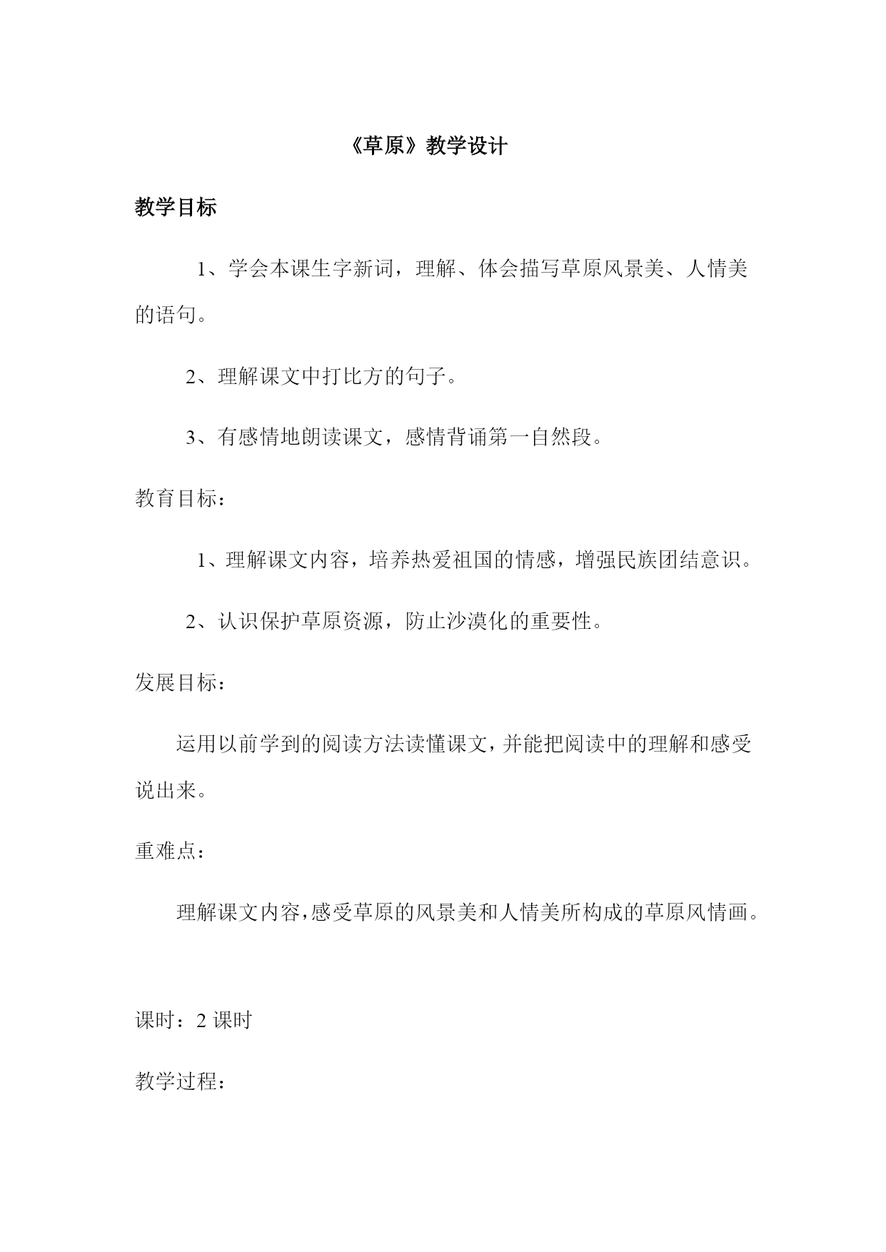 《草原》教学设计教学目标1、学会本课生字新词,理解、体会描写草原风景美、人情美的语句。2、理解课文中打比方的句子。3、有感情地朗读课文,感情背诵第一自然段。教育目标:1、理解课文内容,培养热爱祖国的情感,增强民族团结意识。2、认识保护草原资源,防止沙漠化的重要性。发展目标:运用以前学到的阅读方法读懂课文,并能把阅读中的理解和感受说出来。重难点:理解课文内容,感受草原的风景美和人情美所构成的草原风情画。课时:2课时教学过程:第一课时一、激趣导入1、先播放一段草原景色的视频,再欣赏几张草原图片,带情入境。2、