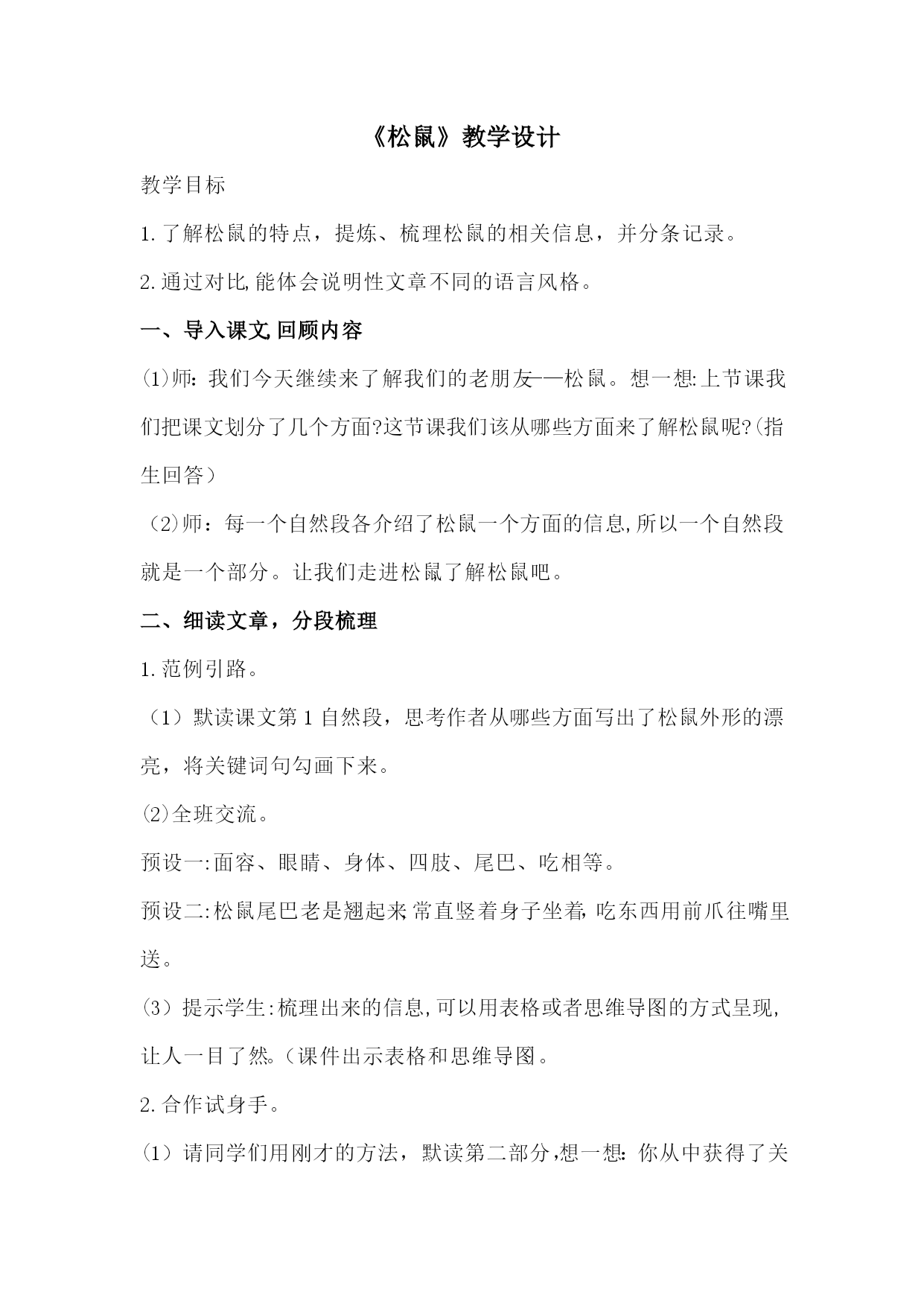 《松鼠》教学设计教学目标1.了解松鼠的特点,提炼、梳理松鼠的相关信息,并分条记录。2.通过对比,能体会说明性文章不同的语言风格。一、导入课文,回顾内容(1)师:我们今天继续来了解我们的老朋友——松鼠。想一想:上节课我们把课文划分了几个方面?这节课我们该从哪些方面来了解松鼠呢?(指生回答)(2)师:每一个自然段各介绍了松鼠一个方面的信息,所以一个自然段就是一个部分。让我们走进松鼠,了解松鼠吧。二、细读文章,分段梳理1.范例引路。(1)默读课文第1自然段,思考作者从哪些方面写出了松鼠外形的漂亮,将关键词句勾画