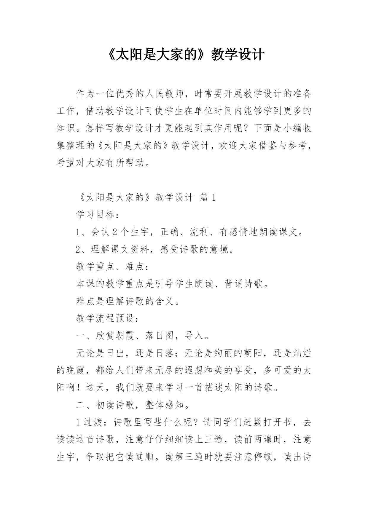 《太阳是大家的》教学设计作为一位优秀的人民教师,时常要开展教学设计的准备工作,借助教学设计可使学生在单位时间内能够学到更多的知识。怎样写教学设计才更能起到其作用呢?下面是小编收集整理的《太阳是大家的》教学设计,欢迎大家借鉴与参考,希望对大家有所帮助。《太阳是大家的》教学设计篇1学习目标:1、会认2个生字,正确、流利、有感情地朗读课文。2、理解课文资料,感受诗歌的意境。教学重点、难点:本课的教学重点是引导学生朗读、背诵诗歌。难点是理解诗歌的含义。教学流程预设:一、欣赏朝霞、落日图,导入。无论是日出,还是日落