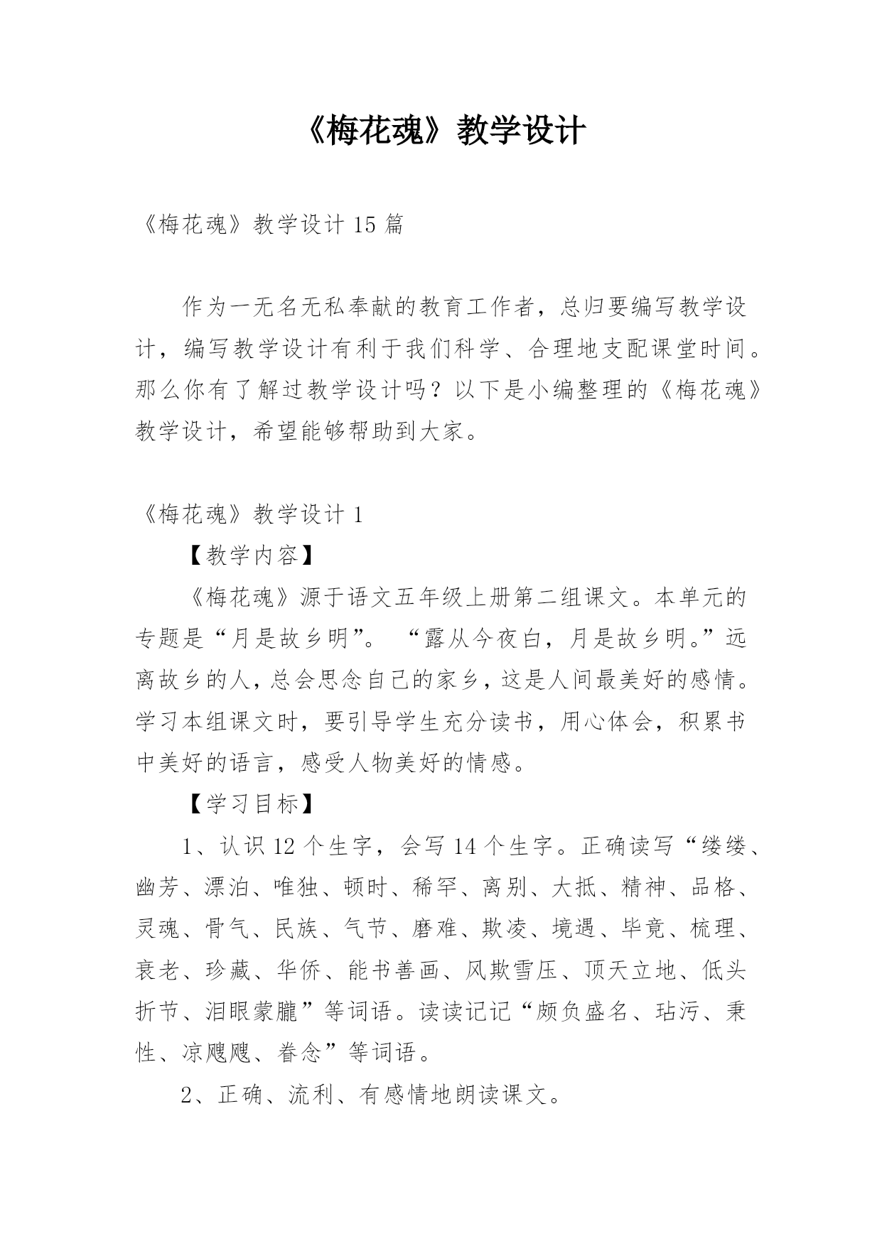 《梅花魂》教学设计《梅花魂》教学设计15篇作为一无名无私奉献的教育工作者,总归要编写教学设计,编写教学设计有利于我们科学、合理地支配课堂时间。那么你有了解过教学设计吗?以下是小编整理的《梅花魂》教学设计,希望能够帮助到大家。《梅花魂》教学设计1【教学内容】《梅花魂》源于语文五年级上册第二组课文。本单元的专题是“月是故乡明”。“露从今夜白,月是故乡明。”远离故乡的人,总会思念自己的家乡,这是人间最美好的感情。学习本组课文时,要引导学生充分读书,用心体会,积累书中美好的语言,感受人物美好的情感。【学习目标】1
