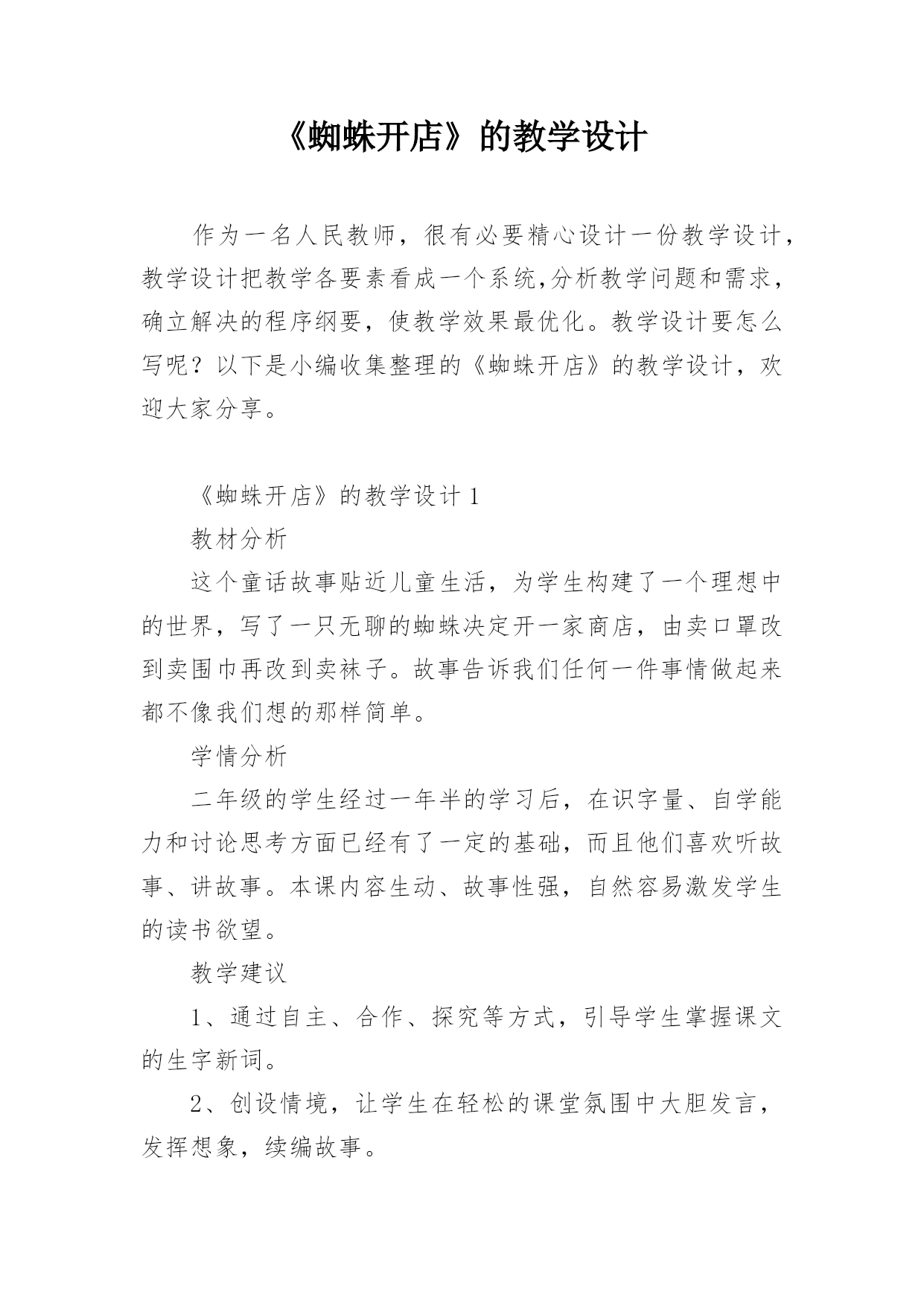 《蜘蛛开店》的教学设计作为一名人民教师,很有必要精心设计一份教学设计,教学设计把教学各要素看成一个系统,分析教学问题和需求,确立解决的程序纲要,使教学效果最优化。教学设计要怎么写呢?以下是小编收集整理的《蜘蛛开店》的教学设计,欢迎大家分享。《蜘蛛开店》的教学设计1教材分析这个童话故事贴近儿童生活,为学生构建了一个理想中的世界,写了一只无聊的蜘蛛决定开一家商店,由卖口罩改到卖围巾再改到卖袜子。故事告诉我们任何一件事情做起来都不像我们想的那样简单。学情分析二年级的学生经过一年半的学习后,在识字量、自学能力和讨
