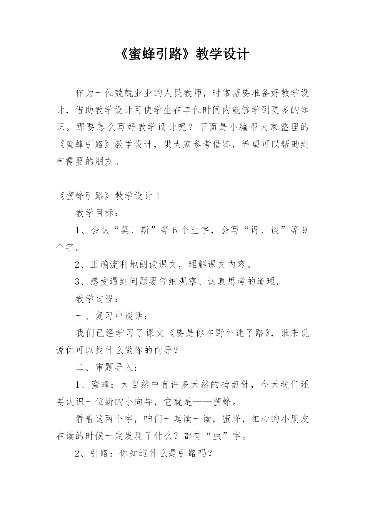 《蜜蜂引路》教学设计作为一位兢兢业业的人民教师,时常需要准备好教学设计,借助教学设计可使学生在单位时间内能够学到更多的知识。那要怎么写好教学设计呢?下面是小编帮大家整理的《蜜蜂引路》教学设计,供大家参考借鉴,希望可以帮助到有需要的朋友。《蜜蜂引路》教学设计1教学目标:1、会认“莫、斯”等6个生字,会写“讶、谈”等9个字。2、正确流利地朗读课文,理解课文内容。3、感受遇到问题要仔细观察、认真思考的道理。教学过程:一、复习中谈话:我们已经学习了课文《要是你在野外迷了路》,谁来说说你可以找什么做你的向导?二、审