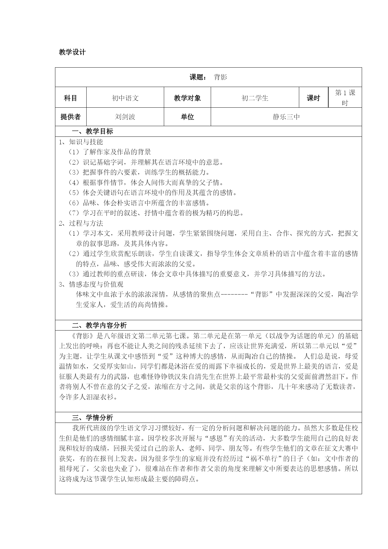 教学设计课题:背影科目初中语文教学对象初二学生课时第1课时提供者刘剑波单位静乐三中一、教学目标1、知识与技能(1)了解作家及作品的背景(2)识记基础字词,并理解其在语言环境中的意思。(3)把握事件的六要素,训练学生的概括能力。(4)根据事件情节,体会人间伟大而真挚的父子情。(5)体会关键语句在语言环境中的作用及其蕴含的感情。(6)品味、体会朴实语言中所蕴含的丰富感情。(7)学习在平时的叙述、抒情中蕴含着的极为精巧的构思。2、过程与方法(1)学习本文,采用教师设计问题,学生紧紧围绕问题,采用自主、合作、探究