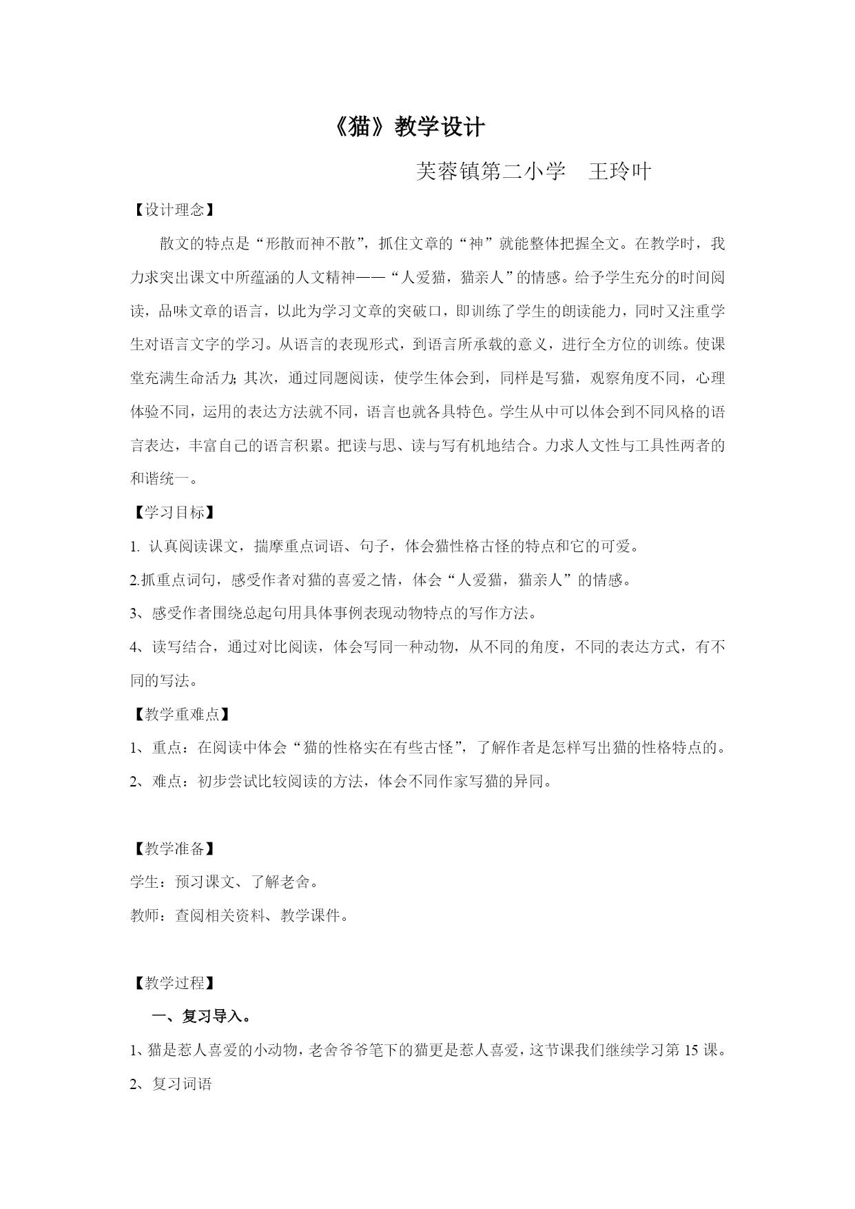 《猫》教学设计芙蓉镇第二小学王玲叶【设计理念】散文的特点是“形散而神不散”,抓住文章的“神”就能整体把握全文。在教学时,我力求突出课文中所蕴涵的人文精神——“人爱猫,猫亲人”的情感。给予学生充分的时间阅读,品味文章的语言,以此为学习文章的突破口,即训练了学生的朗读能力,同时又注重学生对语言文字的学习。从语言的表现形式,到语言所承载的意义,进行全方位的训练。使课堂充满生命活力;其次,通过同题阅读,使学生体会到,同样是写猫,观察角度不同,心理体验不同,运用的表达方法就不同,语言也就各具特色。学生从中可以体会到