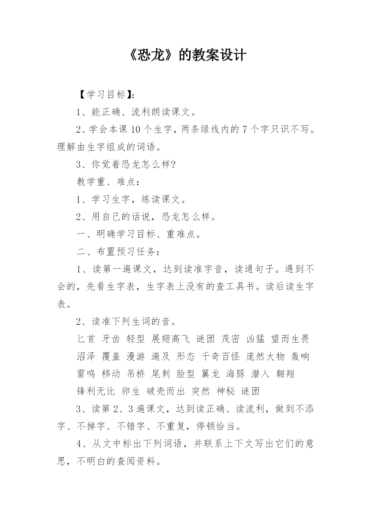 《恐龙》的教案设计【学习目标】:1、能正确、流利朗读课文。2、学会本课10个生字,两条绿线内的7个字只识不写。理解由生字组成的词语。3、你觉着恐龙怎么样?教学重、难点:1、学习生字,练读课文。2、用自己的话说,恐龙怎么样。一、明确学习目标、重难点。二、布置预习任务:1、读第一遍课文,达到读准字音,读通句子。遇到不会的,先看生字表,生字表上没有的查工具书。读后读生字表。2、读准下列生词的音。匕首牙齿轻型展翅高飞谜团茂密凶猛望而生畏沼泽覆盖漫游遍及形态千奇百怪庞然大物轰响雷鸣移动吊桥尾刺脸型翼龙海豚潜入翱翔锋