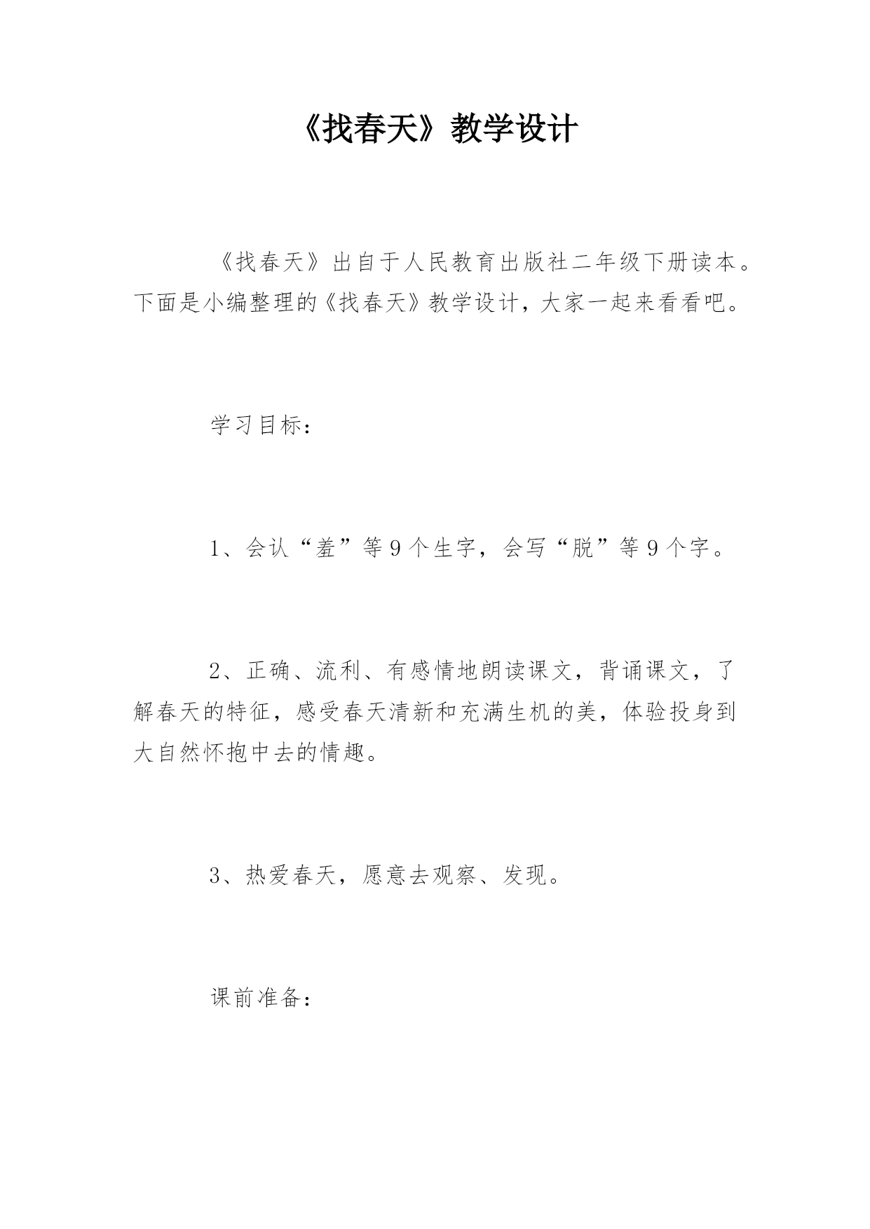 《找春天》教学设计《找春天》出自于人民教育出版社二年级下册读本。下面是小编整理的《找春天》教学设计,大家一起来看看吧。学习目标:1、会认“羞”等9个生字,会写“脱”等9个字。2、正确、流利、有感情地朗读课文,背诵课文,了解春天的特征,感受春天清新和充满生机的美,体验投身到大自然怀抱中去的情趣。3、热爱春天,愿意去观察、发现。课前准备:1、生字卡片。2、板画。3、学生写的描写春天的作文。4、钢琴曲《童年的回忆》。教学过程:一、课题教学。1、盼望着,盼望着,春的脚步近了。让我们用美丽的词语去迎接她的到来吧!(