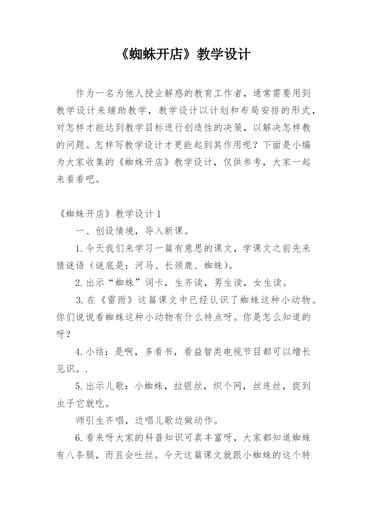 《蜘蛛开店》教学设计作为一名为他人授业解惑的教育工作者,通常需要用到教学设计来辅助教学,教学设计以计划和布局安排的形式,对怎样才能达到教学目标进行创造性的决策,以解决怎样教的问题。怎样写教学设计才更能起到其作用呢?下面是小编为大家收集的《蜘蛛开店》教学设计,仅供参考,大家一起来看看吧。《蜘蛛开店》教学设计1一、创设情境,导入新课。1.今天我们来学习一篇有意思的课文,学课文之前先来猜谜语(谜底是:河马、长颈鹿、蜘蛛)。2.出示“蜘蛛”词卡,生齐读,男生读,女生读。3.在《雷雨》这篇课文中已经认识了蜘蛛这种小