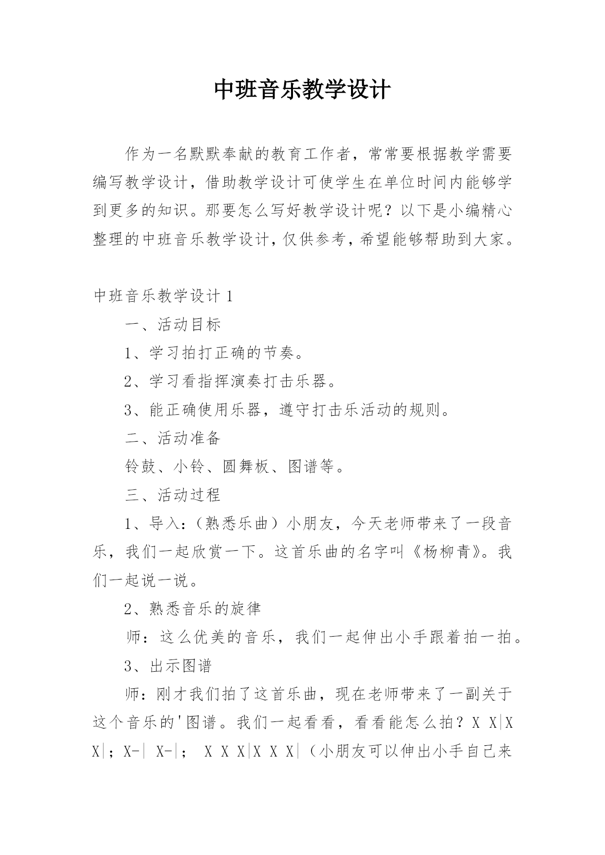 中班音乐教学设计作为一名默默奉献的教育工作者,常常要根据教学需要编写教学设计,借助教学设计可使学生在单位时间内能够学到更多的知识。那要怎么写好教学设计呢?以下是小编精心整理的中班音乐教学设计,仅供参考,希望能够帮助到大家。中班音乐教学设计1一、活动目标1、学习拍打正确的节奏。2、学习看指挥演奏打击乐器。3、能正确使用乐器,遵守打击乐活动的规则。二、活动准备铃鼓、小铃、圆舞板、图谱等。三、活动过程1、导入:(熟悉乐曲)小朋友,今天老师带来了一段音乐,我们一起欣赏一下。这首乐曲的名字叫《杨柳青》。我们一起说一