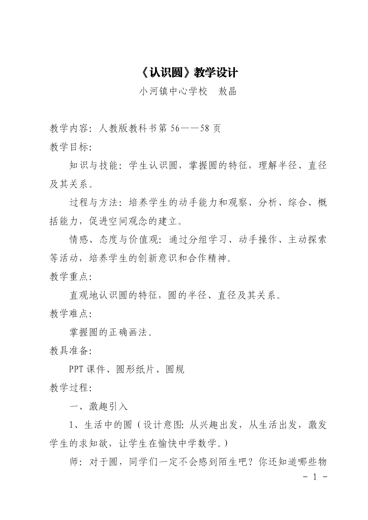 PAGE\*MERGEFORMAT-4-《认识圆》教学设计小河镇中心学校敖晶教学内容:人教版教科书第56——58页教学目标:知识与技能:学生认识圆,掌握圆的特征,理解半径、直径及其关系。过程与方法:培养学生的动手能力和观察、分析、综合、概括能力,促进空间观念的建立。情感、态度与价值观:通过分组学习、动手操作、主动探索等活动,培养学生的创新意识和合作精神。教学重点:直观地认识圆的特征,圆的半径、直径及其关系。教学难点:掌握圆的正确画法。教具准备:PPT课件、圆形纸片、圆规教学过程:一、激趣引入1、生活