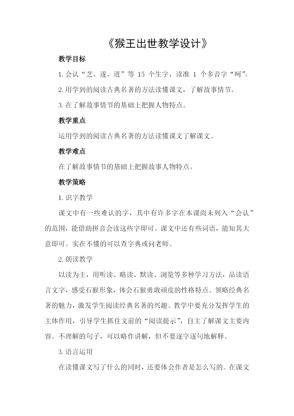 《猴王出世教学设计》教学目标1.会认“芝、遂、迸”等15个生字,读准1个多音字“呵”。2.用学到的阅读古典名著的方法读懂课文,了解故事情节。3.在了解故事情节的基础上把握人物特点。教学重点运用学到的阅读古典名著的方法读懂课文了解课文。教学难点在了解故事情节的基础上把握故事人物特点。教学策略1.识字教学课文中有一些难认的字,其中有许多字在本课尚未列入“会认”的范围,能借助拼音会读这些字即可。课文中还有些词语,能知其大意即可。实在不懂的可以查字典或问老师。2.朗读教学以读为主,用听读、略读、默读、浏览等多种学