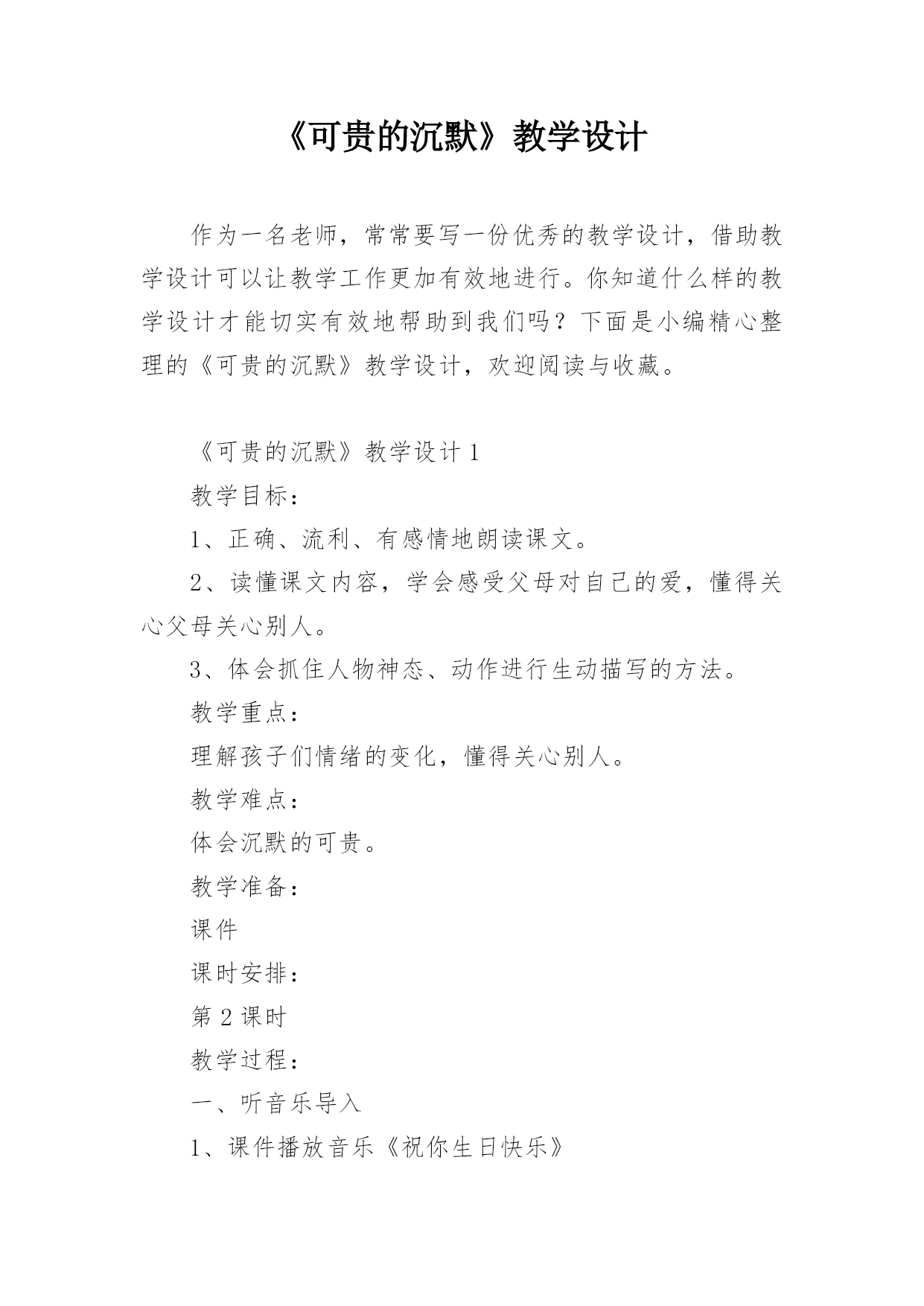 《可贵的沉默》教学设计作为一名老师,常常要写一份优秀的教学设计,借助教学设计可以让教学工作更加有效地进行。你知道什么样的教学设计才能切实有效地帮助到我们吗?下面是小编精心整理的《可贵的沉默》教学设计,欢迎阅读与收藏。《可贵的沉默》教学设计1教学目标:1、正确、流利、有感情地朗读课文。2、读懂课文内容,学会感受父母对自己的爱,懂得关心父母关心别人。3、体会抓住人物神态、动作进行生动描写的方法。教学重点:理解孩子们情绪的变化,懂得关心别人。教学难点:体会沉默的可贵。教学准备:课件课时安排:第2课时教学过程:一