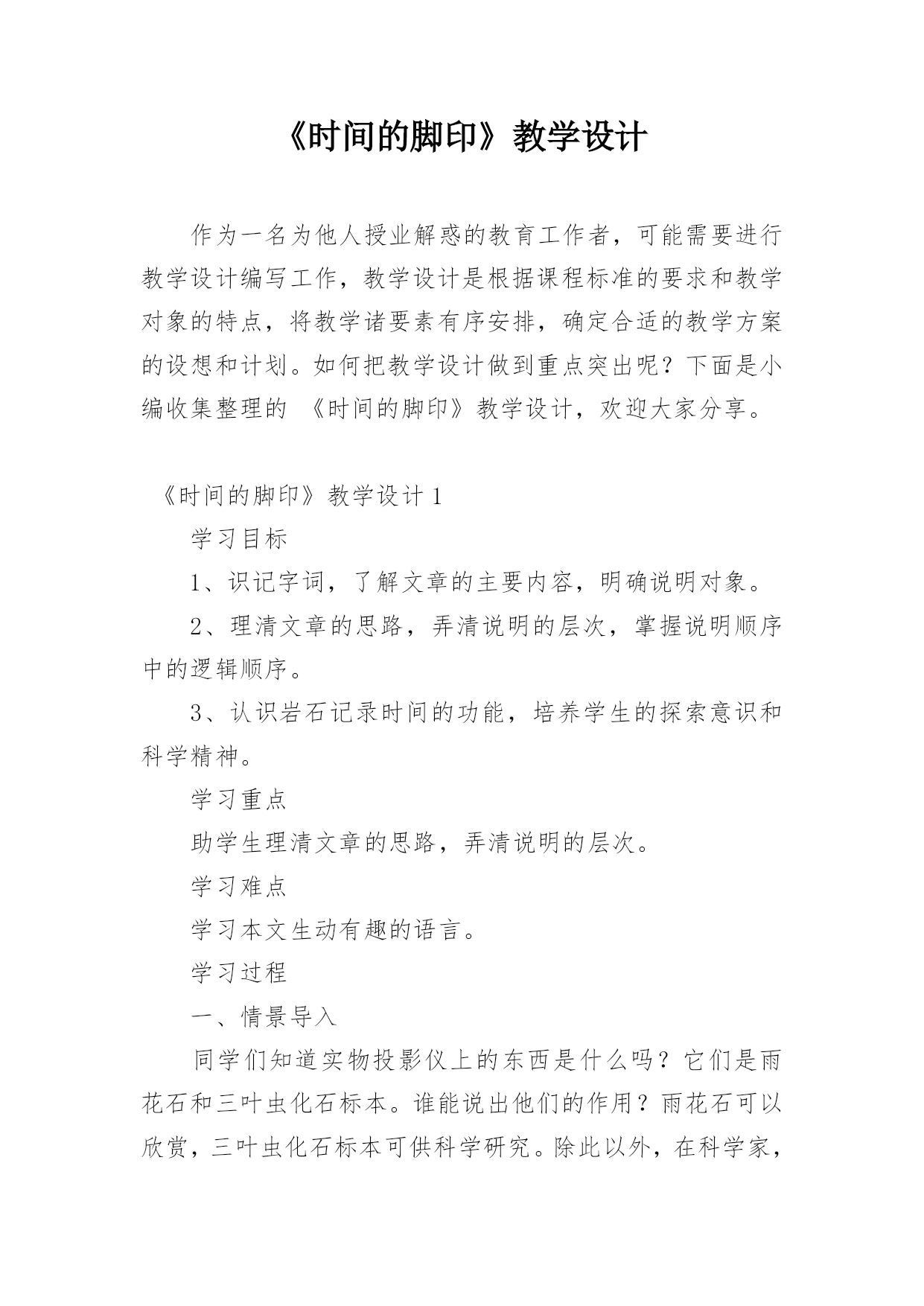 《时间的脚印》教学设计作为一名为他人授业解惑的教育工作者,可能需要进行教学设计编写工作,教学设计是根据课程标准的要求和教学对象的特点,将教学诸要素有序安排,确定合适的教学方案的设想和计划。如何把教学设计做到重点突出呢?下面是小编收集整理的《时间的脚印》教学设计,欢迎大家分享。《时间的脚印》教学设计1学习目标1、识记字词,了解文章的主要内容,明确说明对象。2、理清文章的思路,弄清说明的层次,掌握说明顺序中的逻辑顺序。3、认识岩石记录时间的功能,培养学生的探索意识和科学精神。学习重点助学生理清文章的思路,弄清