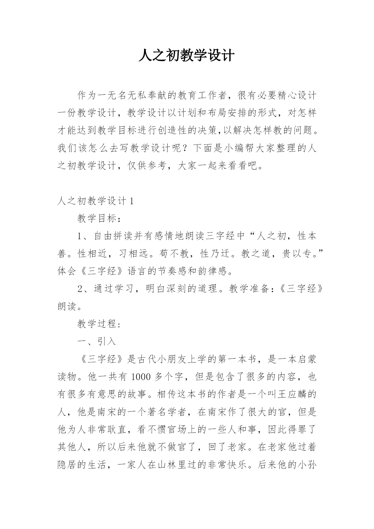 人之初教学设计作为一无名无私奉献的教育工作者,很有必要精心设计一份教学设计,教学设计以计划和布局安排的形式,对怎样才能达到教学目标进行创造性的决策,以解决怎样教的问题。我们该怎么去写教学设计呢?下面是小编帮大家整理的人之初教学设计,仅供参考,大家一起来看看吧。人之初教学设计1教学目标:1、自由拼读并有感情地朗读三字经中“人之初,性本善。性相近,习相远。苟不教,性乃迁。教之道,贵以专。”体会《三字经》语言的节奏感和韵律感。2、通过学习,明白深刻的道理。教学准备:《三字经》朗读。教学过程:一、引入《三字经》是