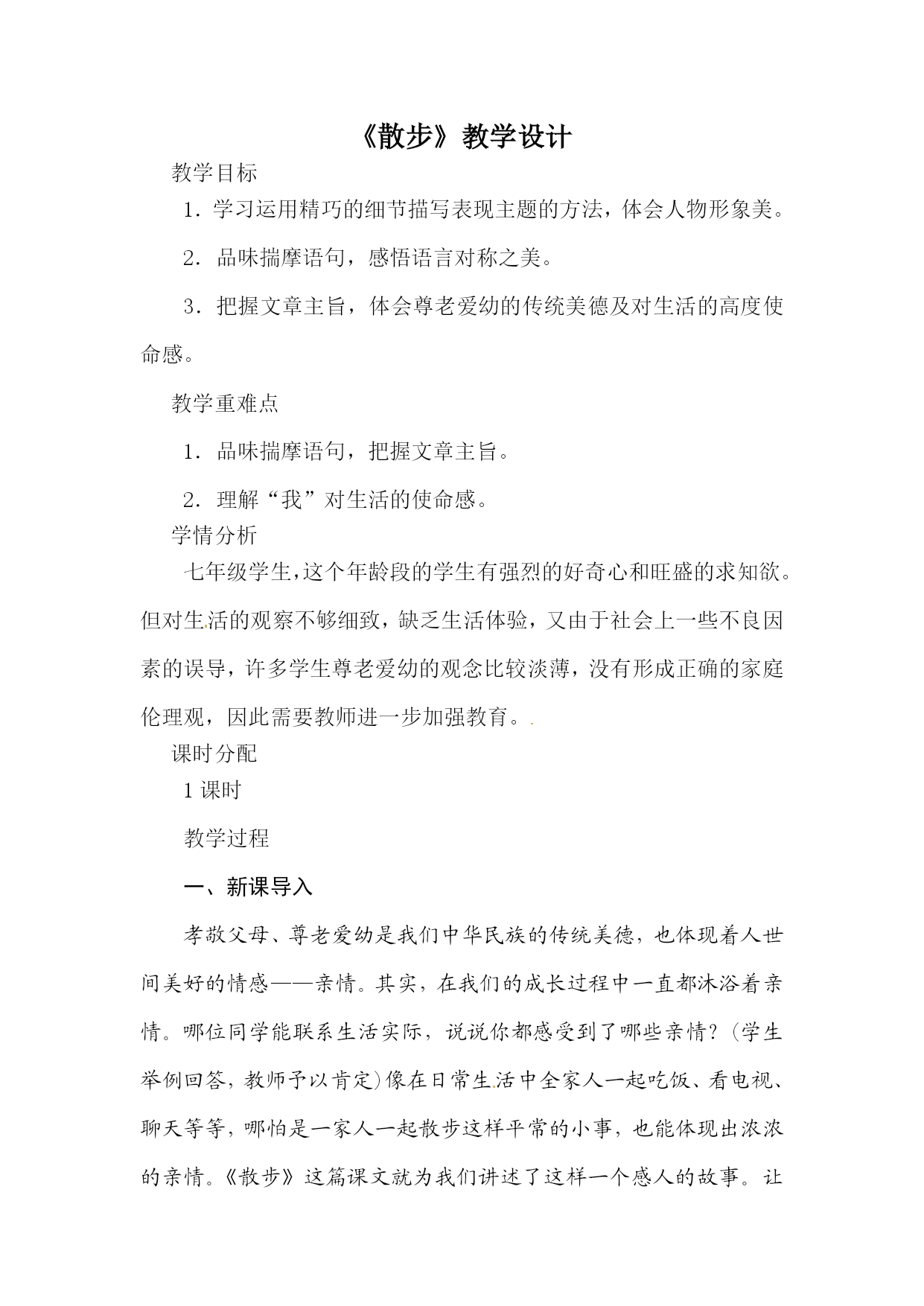 《散步》教学设计eq\a\vs4\al(教学目标)1.学习运用精巧的细节描写表现主题的方法,体会人物形象美。2.品味揣摩语句,感悟语言对称之美。3.把握文章主旨,体会尊老爱幼的传统美德及对生活的高度使命感。eq\a\vs4\al(教学重难点)[来源:学,科,网]1.品味揣摩语句,把握文章主旨。2.理解“我”对生活的使命感。xkb1.comeq\a\vs4\al(学情分析)七年级学生,这个年龄段的学生有强烈的好奇心和旺盛的求知欲。但对生活的观察不够细致,缺乏生活体验,又由于社会上一些不良因