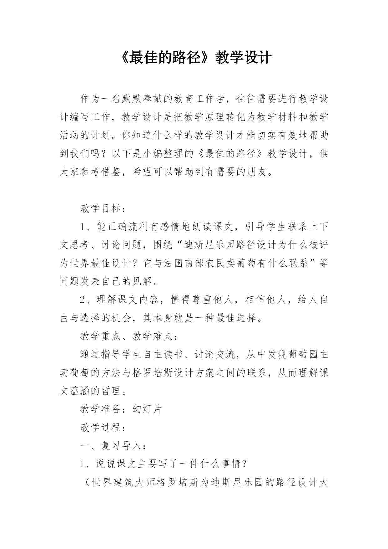 《最佳的路径》教学设计作为一名默默奉献的教育工作者,往往需要进行教学设计编写工作,教学设计是把教学原理转化为教学材料和教学活动的计划。你知道什么样的教学设计才能切实有效地帮助到我们吗?以下是小编整理的《最佳的路径》教学设计,供大家参考借鉴,希望可以帮助到有需要的朋友。教学目标:1、能正确流利有感情地朗读课文,引导学生联系上下文思考、讨论问题,围绕“迪斯尼乐园路径设计为什么被评为世界最佳设计?它与法国南部农民卖葡萄有什么联系”等问题发表自己的见解。2、理解课文内容,懂得尊重他人,相信他人,给人自由与选择的机