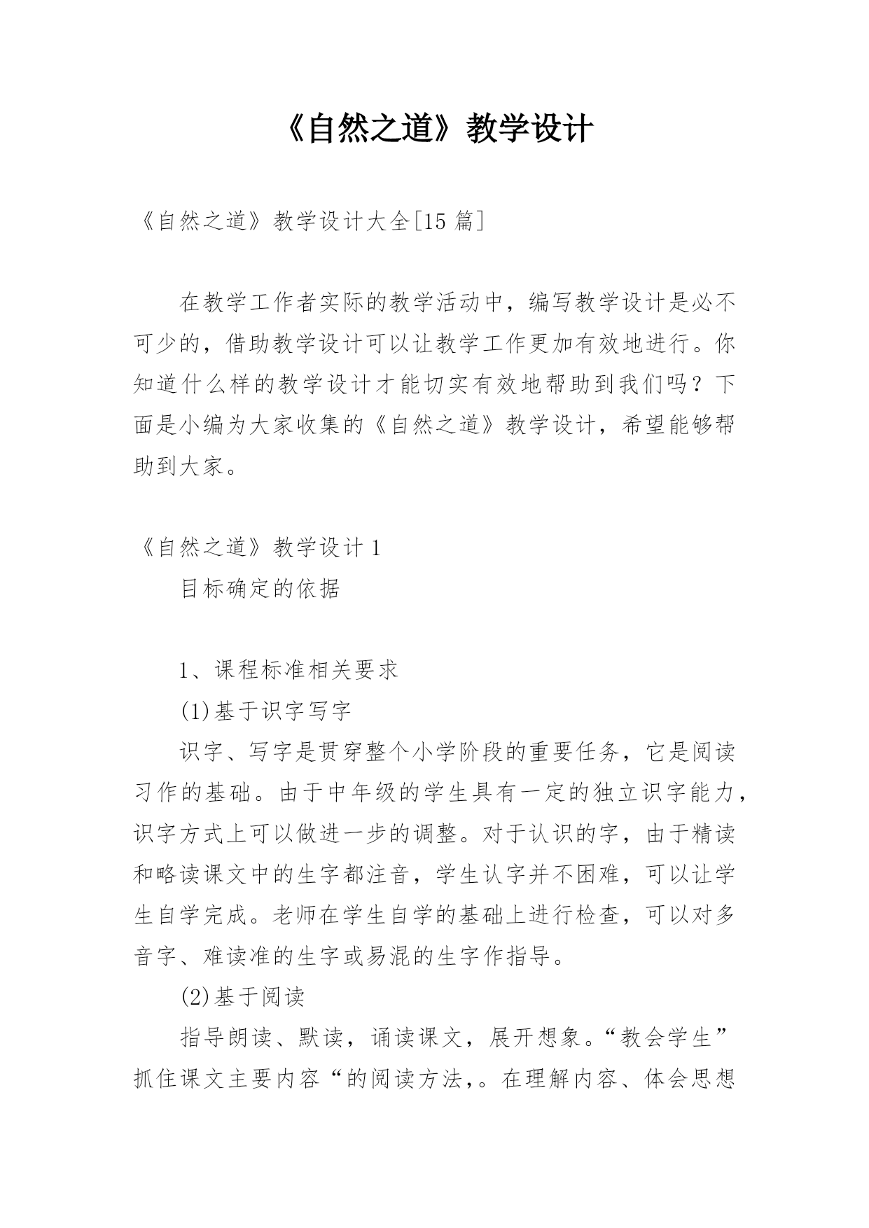 《自然之道》教学设计《自然之道》教学设计大全[15篇]在教学工作者实际的教学活动中,编写教学设计是必不可少的,借助教学设计可以让教学工作更加有效地进行。你知道什么样的教学设计才能切实有效地帮助到我们吗?下面是小编为大家收集的《自然之道》教学设计,希望能够帮助到大家。《自然之道》教学设计1目标确定的依据1、课程标准相关要求(1)基于识字写字识字、写字是贯穿整个小学阶段的重要任务,它是阅读习作的基础。由于中年级的学生具有一定的独立识字能力,识字方式上可以做进一步的调整。对于认识的字,由于精读和略读课文中的生字