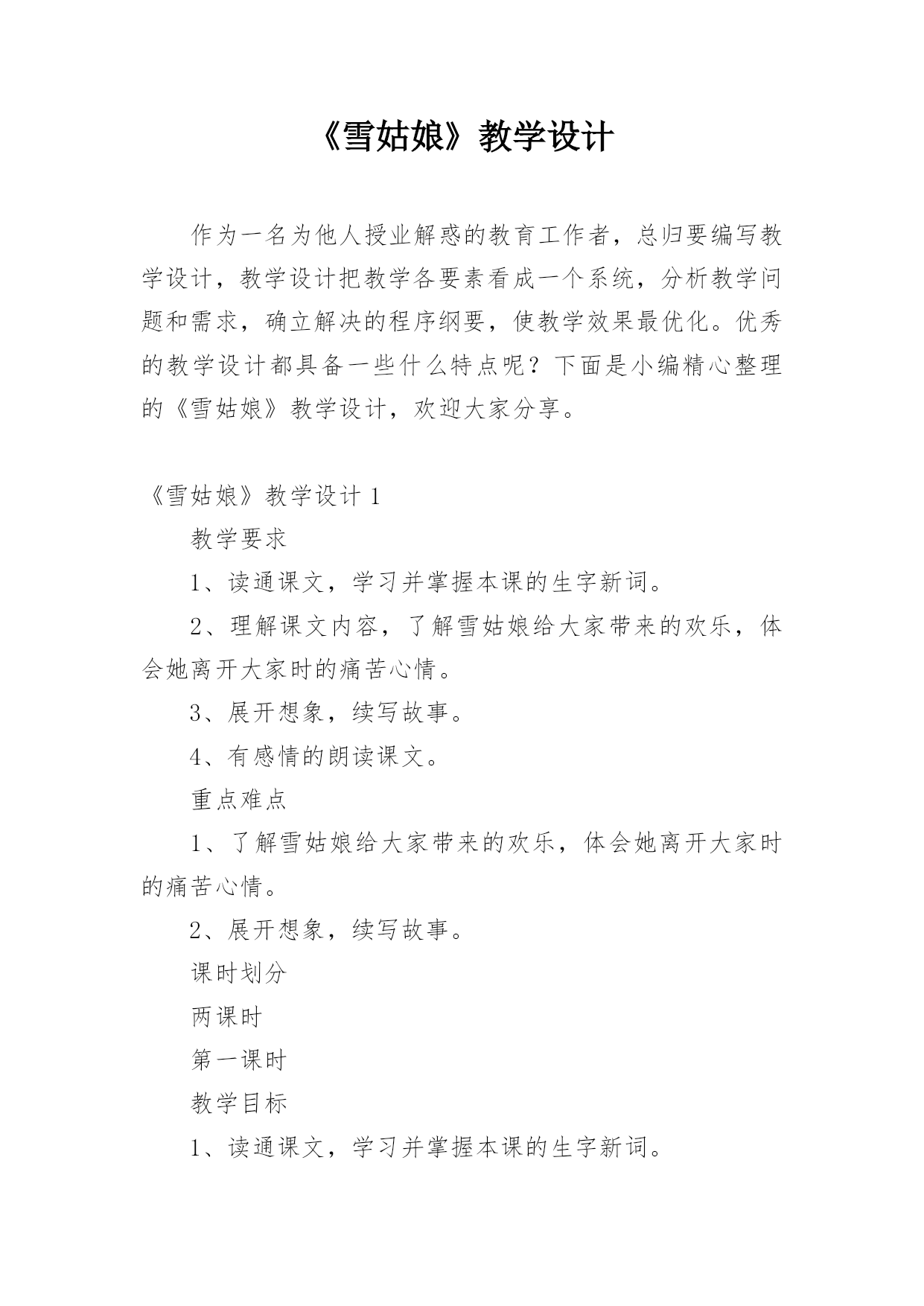 《雪姑娘》教学设计作为一名为他人授业解惑的教育工作者,总归要编写教学设计,教学设计把教学各要素看成一个系统,分析教学问题和需求,确立解决的程序纲要,使教学效果最优化。优秀的教学设计都具备一些什么特点呢?下面是小编精心整理的《雪姑娘》教学设计,欢迎大家分享。《雪姑娘》教学设计1教学要求1、读通课文,学习并掌握本课的生字新词。2、理解课文内容,了解雪姑娘给大家带来的欢乐,体会她离开大家时的痛苦心情。3、展开想象,续写故事。4、有感情的朗读课文。重点难点1、了解雪姑娘给大家带来的欢乐,体会她离开大家时的痛苦心情