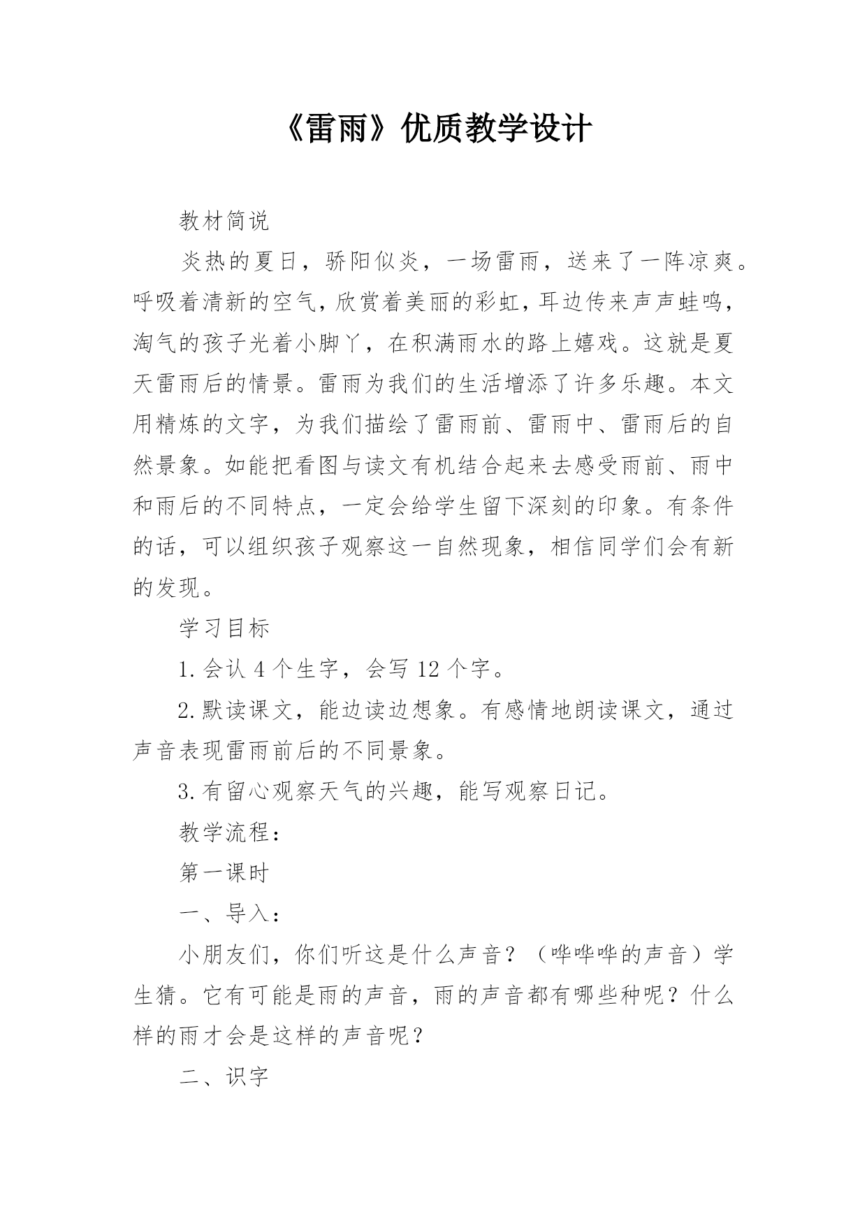 《雷雨》优质教学设计教材简说炎热的夏日,骄阳似炎,一场雷雨,送来了一阵凉爽。呼吸着清新的空气,欣赏着美丽的彩虹,耳边传来声声蛙鸣,淘气的孩子光着小脚丫,在积满雨水的路上嬉戏。这就是夏天雷雨后的情景。雷雨为我们的生活增添了许多乐趣。本文用精炼的文字,为我们描绘了雷雨前、雷雨中、雷雨后的自然景象。如能把看图与读文有机结合起来去感受雨前、雨中和雨后的不同特点,一定会给学生留下深刻的印象。有条件的话,可以组织孩子观察这一自然现象,相信同学们会有新的发现。学习目标1.会认4个生字,会写12个字。2.默读课文,能边读