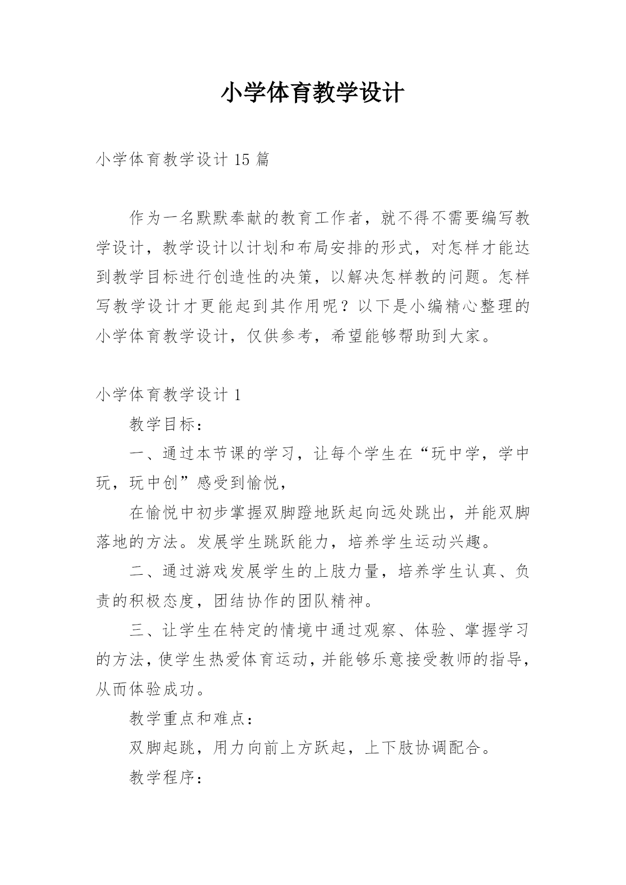 小学体育教学设计小学体育教学设计15篇作为一名默默奉献的教育工作者,就不得不需要编写教学设计,教学设计以计划和布局安排的形式,对怎样才能达到教学目标进行创造性的决策,以解决怎样教的问题。怎样写教学设计才更能起到其作用呢?以下是小编精心整理的小学体育教学设计,仅供参考,希望能够帮助到大家。小学体育教学设计1教学目标:一、通过本节课的学习,让每个学生在“玩中学,学中玩,玩中创”感受到愉悦,在愉悦中初步掌握双脚蹬地跃起向远处跳出,并能双脚落地的方法。发展学生跳跃能力,培养学生运动兴趣。二、通过游戏发展学生的上肢