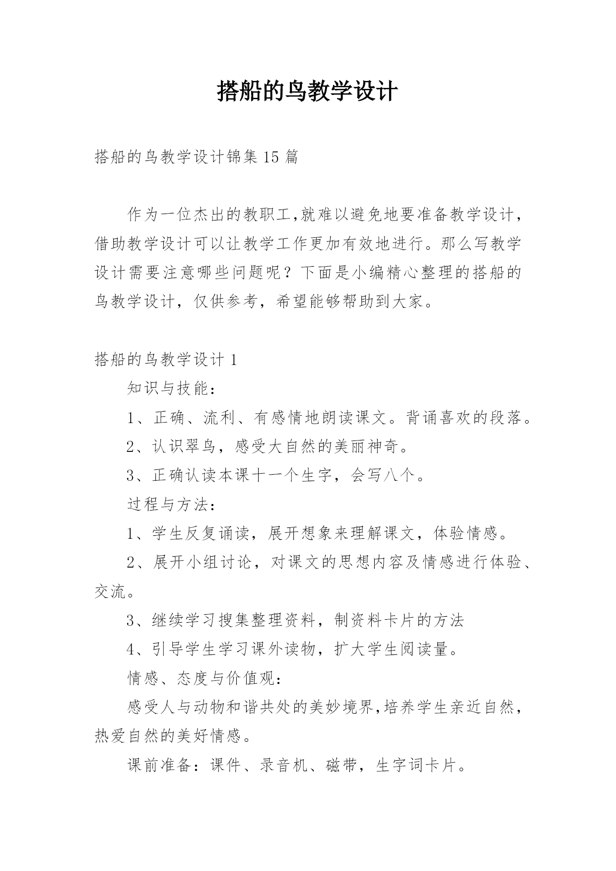 搭船的鸟教学设计搭船的鸟教学设计锦集15篇作为一位杰出的教职工,就难以避免地要准备教学设计,借助教学设计可以让教学工作更加有效地进行。那么写教学设计需要注意哪些问题呢?下面是小编精心整理的搭船的鸟教学设计,仅供参考,希望能够帮助到大家。搭船的鸟教学设计1知识与技能:1、正确、流利、有感情地朗读课文。背诵喜欢的段落。2、认识翠鸟,感受大自然的美丽神奇。3、正确认读本课十一个生字,会写八个。过程与方法:1、学生反复诵读,展开想象来理解课文,体验情感。2、展开小组讨论,对课文的思想内容及情感进行体验、交流。3、