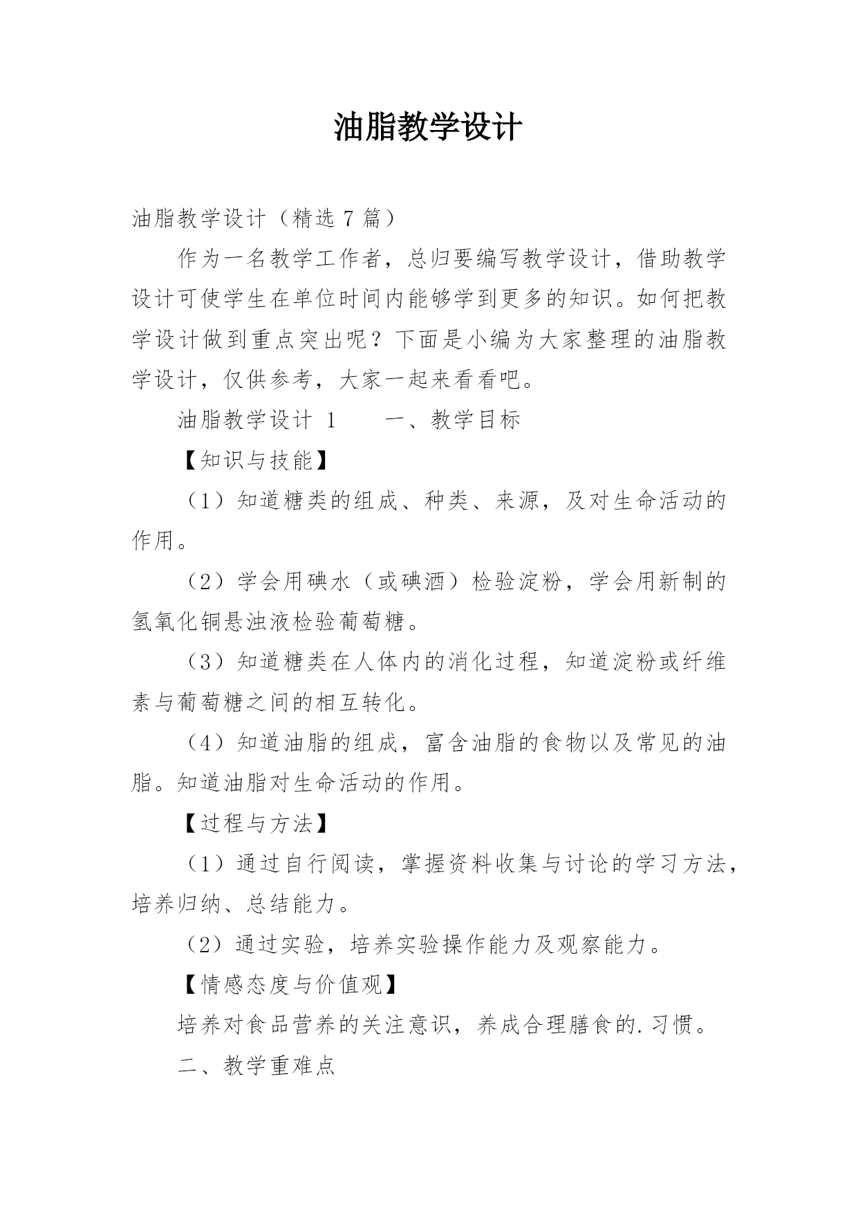 油脂教学设计油脂教学设计(精选7篇)作为一名教学工作者,总归要编写教学设计,借助教学设计可使学生在单位时间内能够学到更多的知识。如何把教学设计做到重点突出呢?下面是小编为大家整理的油脂教学设计,仅供参考,大家一起来看看吧。油脂教学设计1一、教学目标【知识与技能】(1)知道糖类的组成、种类、来源,及对生命活动的作用。(2)学会用碘水(或碘酒)检验淀粉,学会用新制的氢氧化铜悬浊液检验葡萄糖。(3)知道糖类在人体内的消化过程,知道淀粉或纤维素与葡萄糖之间的相互转化。(4)知道油脂的组成,富含油脂的食物以及常见的