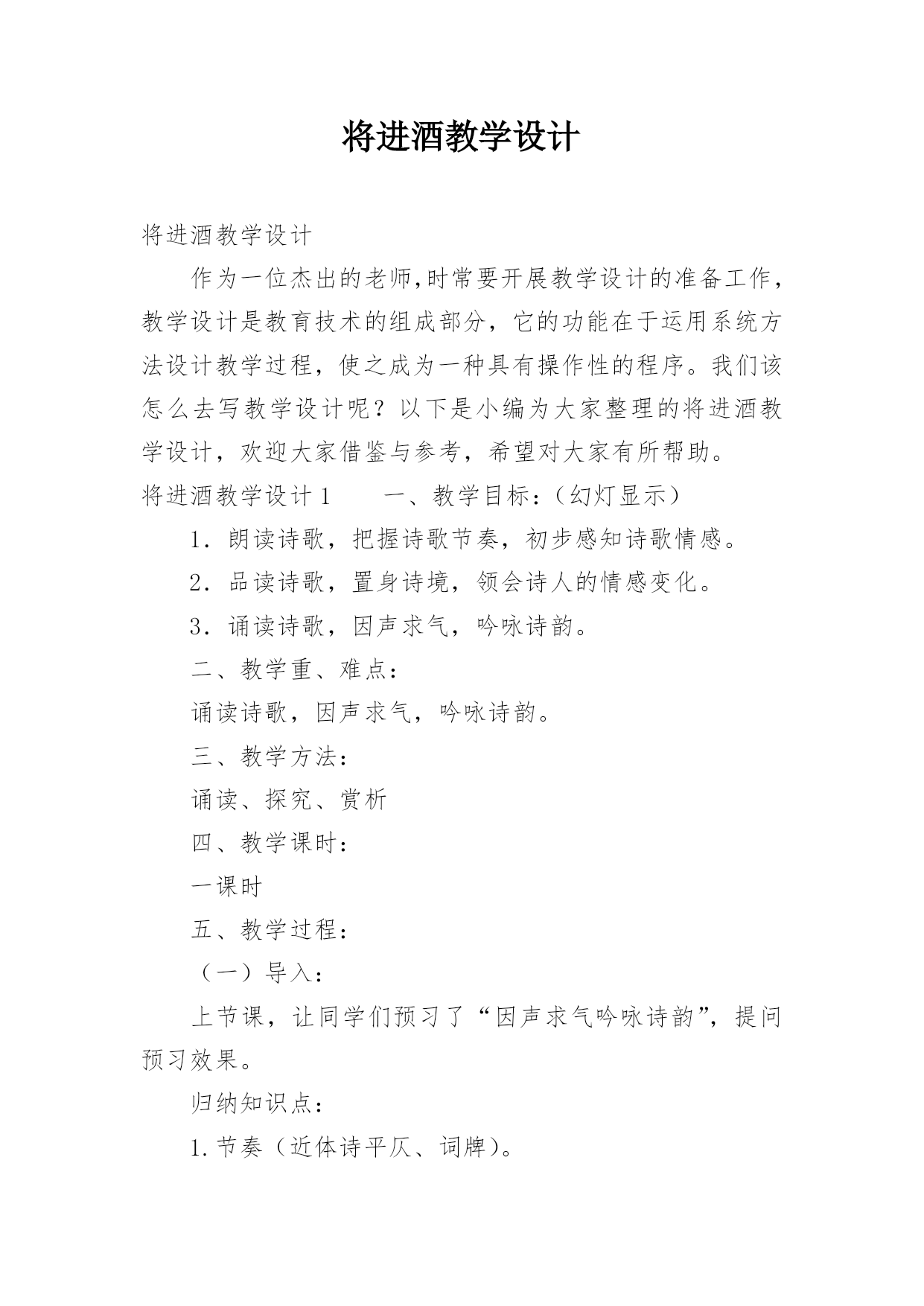 将进酒教学设计将进酒教学设计作为一位杰出的老师,时常要开展教学设计的准备工作,教学设计是教育技术的组成部分,它的功能在于运用系统方法设计教学过程,使之成为一种具有操作性的程序。我们该怎么去写教学设计呢?以下是小编为大家整理的将进酒教学设计,欢迎大家借鉴与参考,希望对大家有所帮助。将进酒教学设计1一、教学目标:(幻灯显示)1.朗读诗歌,把握诗歌节奏,初步感知诗歌情感。2.品读诗歌,置身诗境,领会诗人的情感变化。3.诵读诗歌,因声求气,吟咏诗韵。二、教学重、难点:诵读诗歌,因声求气,吟咏诗韵。三、教学方法:诵