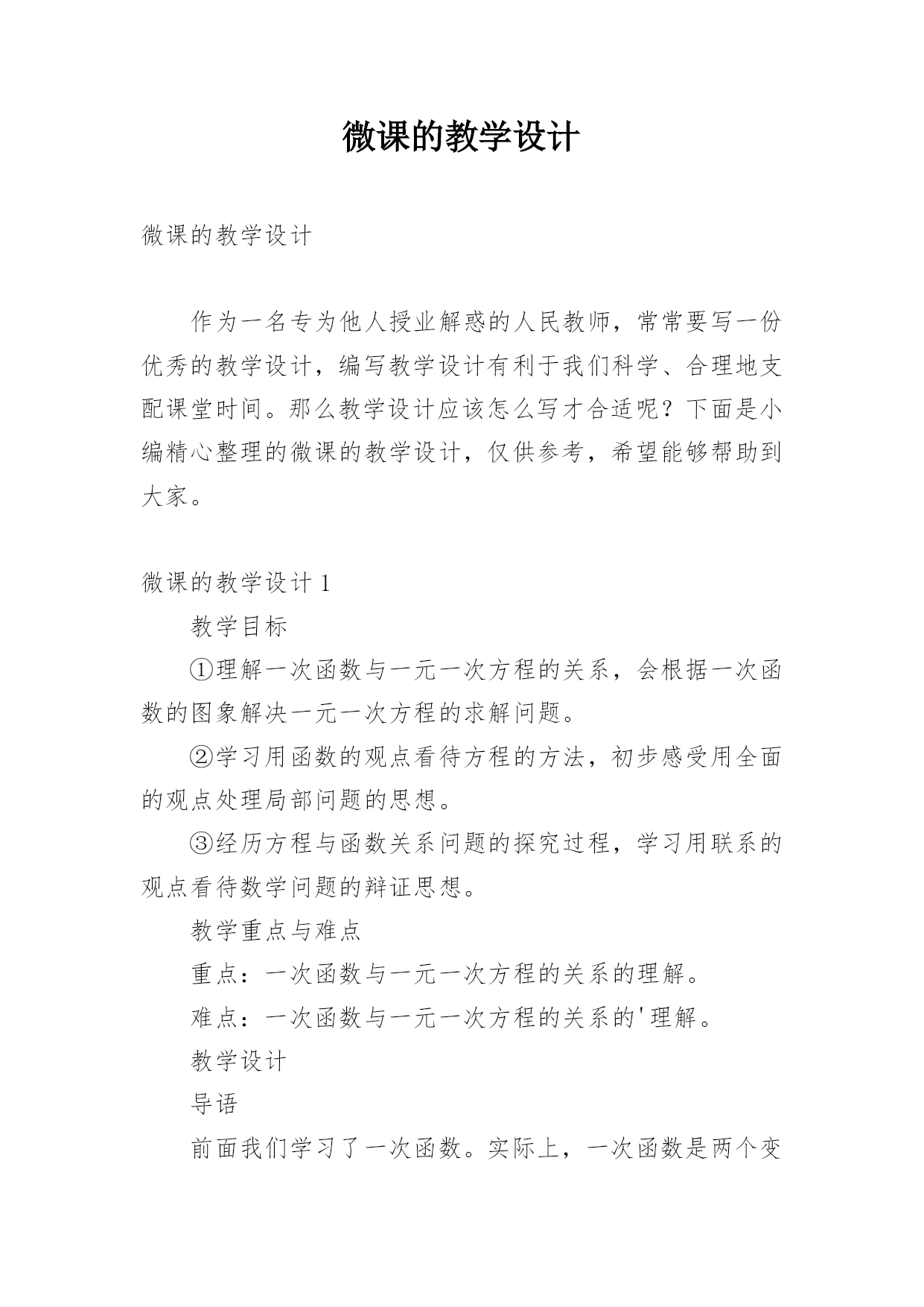 微课的教学设计微课的教学设计作为一名专为他人授业解惑的人民教师,常常要写一份优秀的教学设计,编写教学设计有利于我们科学、合理地支配课堂时间。那么教学设计应该怎么写才合适呢?下面是小编精心整理的微课的教学设计,仅供参考,希望能够帮助到大家。微课的教学设计1教学目标①理解一次函数与一元一次方程的关系,会根据一次函数的图象解决一元一次方程的求解问题。②学习用函数的观点看待方程的方法,初步感受用全面的观点处理局部问题的思想。③经历方程与函数关系问题的探究过程,学习用联系的观点看待数学问题的辩证思想。教学重点与难点