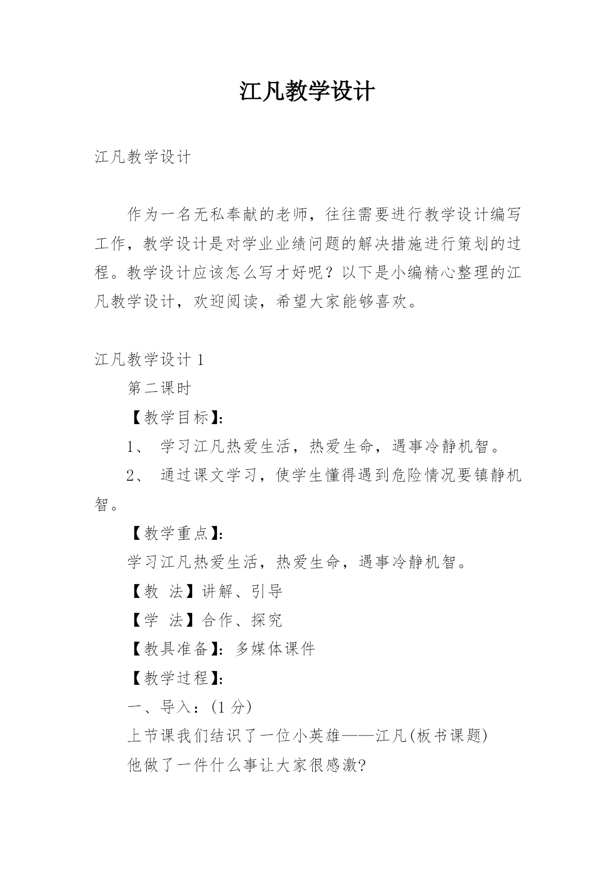 江凡教学设计江凡教学设计作为一名无私奉献的老师,往往需要进行教学设计编写工作,教学设计是对学业业绩问题的解决措施进行策划的过程。教学设计应该怎么写才好呢?以下是小编精心整理的江凡教学设计,欢迎阅读,希望大家能够喜欢。江凡教学设计1第二课时【教学目标】:1、学习江凡热爱生活,热爱生命,遇事冷静机智。2、通过课文学习,使学生懂得遇到危险情况要镇静机智。【教学重点】:学习江凡热爱生活,热爱生命,遇事冷静机智。【教法】讲解、引导【学法】合作、探究【教具准备】:多媒体课件【教学过程】:一、导入:(1分)上节课我们结