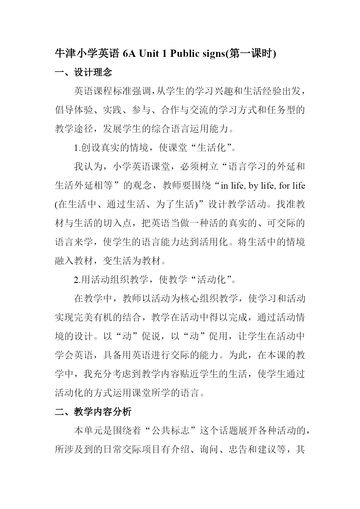 牛津小学英语6AUnit1Publicsigns(第一课时)设计理念英语课程标准强调,从学生的学习兴趣和生活经验出发,倡导体验、实践、参与、合作与交流的学习方式和任务型的教学途径,发展学生的综合语言运用能力。创设真实的情境,使课堂“生活化”。我认为,小学英语课堂,必须树立“语言学习的外延和生活外延相等”的观念,教师要围绕“inlife,bylife,forlife(在生活中、通过生活、为了生活)”设计教学活动。找准教材与生活的切入点,把英语当做一种活的真实的、可交际的语言来学,使学生的语言能力达到活用化。
