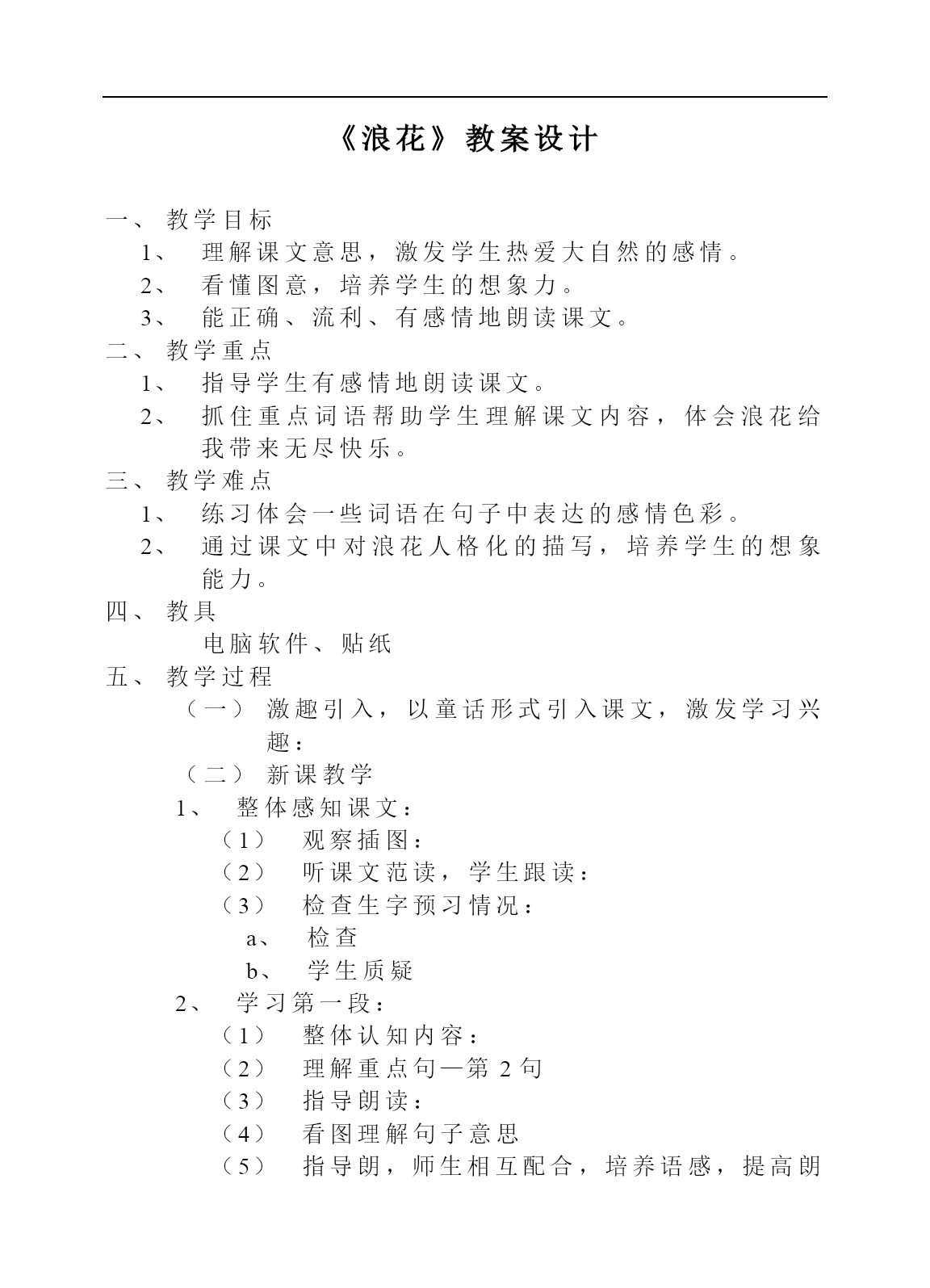 《浪花》教案设计教学目标理解课文意思,激发学生热爱大自然的感情。看懂图意,培养学生的想象力。能正确、流利、有感情地朗读课文。教学重点指导学生有感情地朗读课文。抓住重点词语帮助学生理解课文内容,体会浪花给我带来无尽快乐。教学难点练习体会一些词语在句子中表达的感情色彩。通过课文中对浪花人格化的描写,培养学生的想象能力。教具电脑软件、贴纸教学过程激趣引入,以童话形式引入课文,激发学习兴趣:新课教学整体感知课文:观察插图:听课文范读,学生跟读:检查生字预习情况:检查学生质疑学习第一段:整体认知内容:理解重点句—第