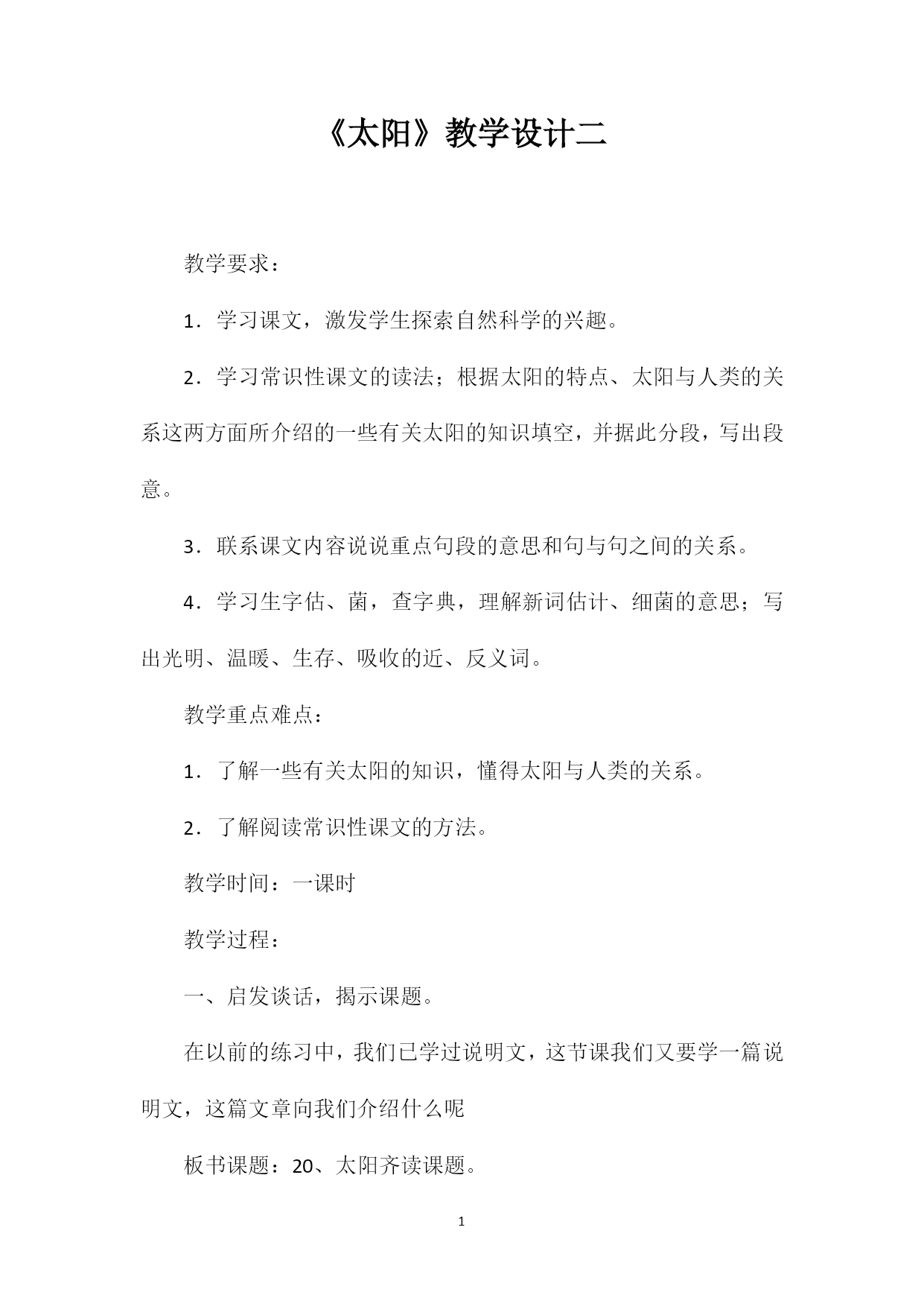 PAGEPAGE5《太阳》教学设计二教学要求:1.学习课文,激发学生探索自然科学的兴趣。2.学习常识性课文的读法;根据太阳的特点、太阳与人类的关系这两方面所介绍的一些有关太阳的知识填空,并据此分段,写出段意。3.联系课文内容说说重点句段的意思和句与句之间的关系。4.学习生字估、菌,查字典,理解新词估计、细菌的意思;写出光明、温暖、生存、吸收的近、反义词。教学重点难点:1.了解一些有关太阳的知识,懂得太阳与人类的关系。2.了解阅读常识性课文的方法。教学时间:一课时教学过程:一、启发谈话,揭示课题