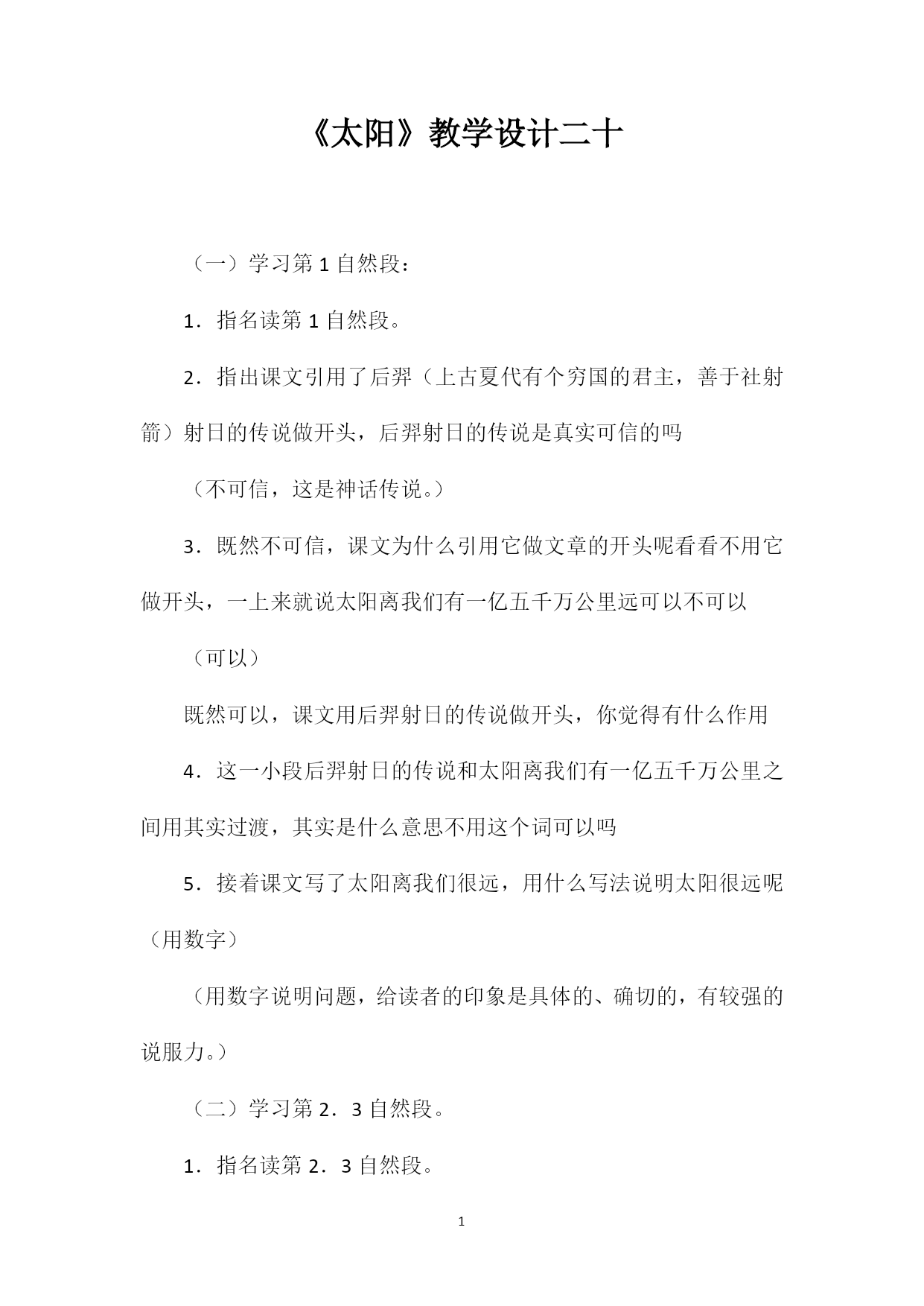 PAGEPAGE4《太阳》教学设计二十(一)学习第1自然段:1.指名读第1自然段。2.指出课文引用了后羿(上古夏代有个穷国的君主,善于社射箭)射日的传说做开头,后羿射日的传说是真实可信的吗(不可信,这是神话传说。)3.既然不可信,课文为什么引用它做文章的开头呢看看不用它做开头,一上来就说太阳离我们有一亿五千万公里远可以不可以(可以)既然可以,课文用后羿射日的传说做开头,你觉得有什么作用4.这一小段后羿射日的传说和太阳离我们有一亿五千万公里之间用其实过渡,其实是什么意思不用这个词可以吗5.接着课