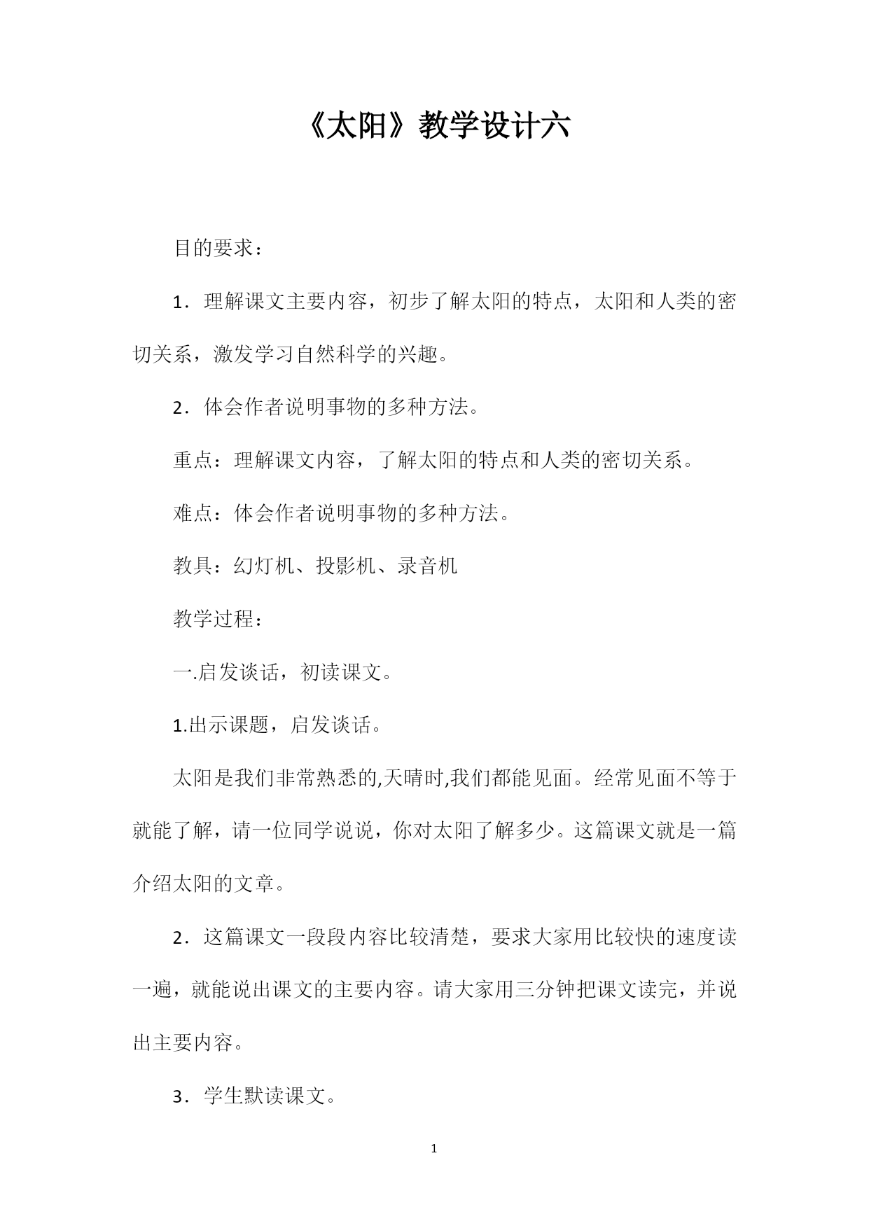 PAGEPAGE3《太阳》教学设计六目的要求:1.理解课文主要内容,初步了解太阳的特点,太阳和人类的密切关系,激发学习自然科学的兴趣。2.体会作者说明事物的多种方法。重点:理解课文内容,了解太阳的特点和人类的密切关系。难点:体会作者说明事物的多种方法。教具:幻灯机、投影机、录音机教学过程:一.启发谈话,初读课文。1.出示课题,启发谈话。太阳是我们非常熟悉的,天晴时,我们都能见面。经常见面不等于就能了解,请一位同学说说,你对太阳了解多少。这篇课文就是一篇介绍太阳的文章。2.这篇课文一段段内容比较