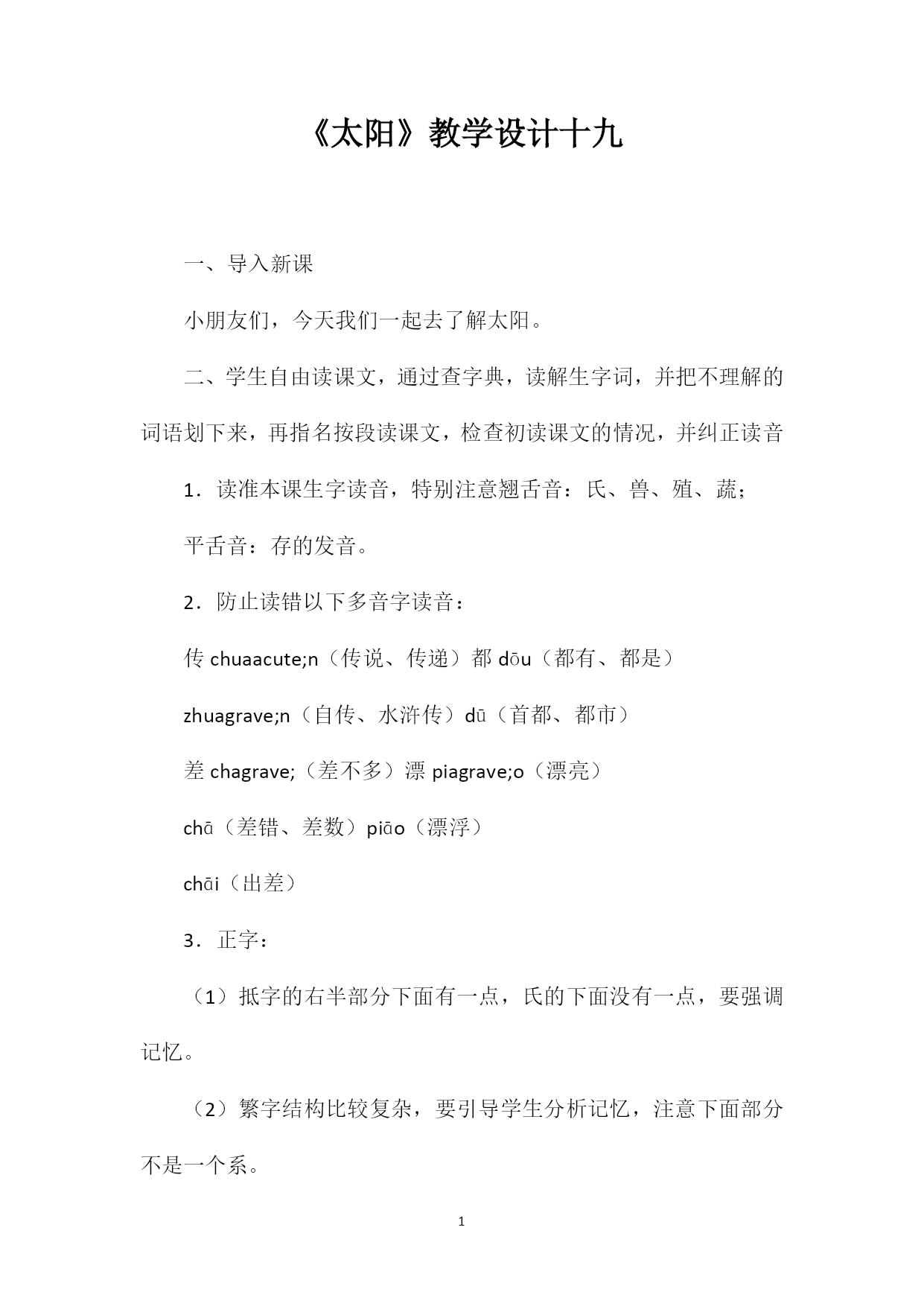 PAGEPAGE2《太阳》教学设计十九一、导入新课小朋友们,今天我们一起去了解太阳。二、学生自由读课文,通过查字典,读解生字词,并把不理解的词语划下来,再指名按段读课文,检查初读课文的情况,并纠正读音1.读准本课生字读音,特别注意翘舌音:氏、兽、殖、蔬;平舌音:存的发音。2.防止读错以下多音字读音:传chuaacute;n(传说、传递)都dōu(都有、都是)zhuagrave;n(自传、水浒传)dū(首都、都市)差chagrave;(差不多)漂piagrave;o(漂亮)chā(差错、差数)p
