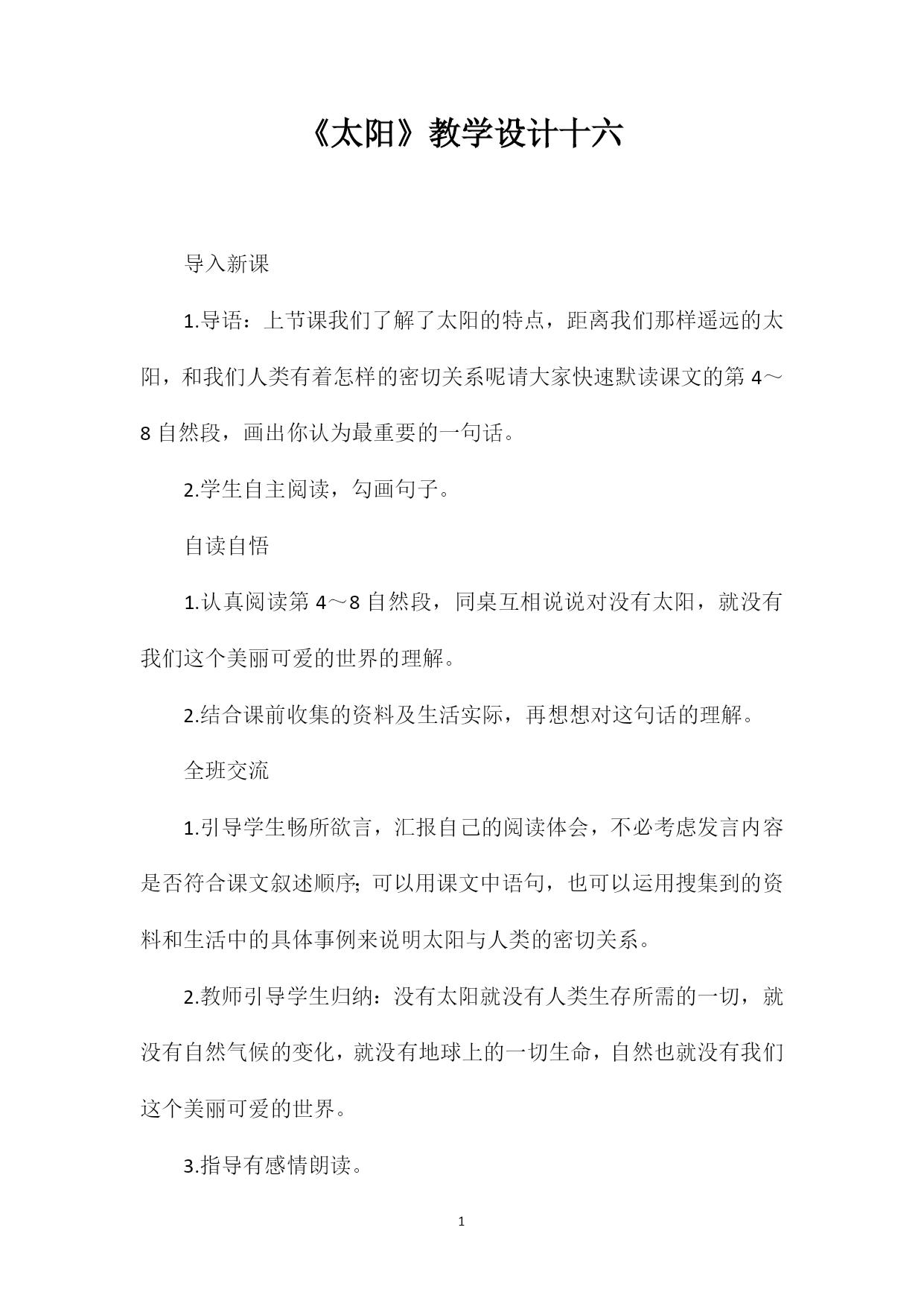 PAGEPAGE2《太阳》教学设计十六导入新课1.导语:上节课我们了解了太阳的特点,距离我们那样遥远的太阳,和我们人类有着怎样的密切关系呢请大家快速默读课文的第4~8自然段,画出你认为最重要的一句话。2.学生自主阅读,勾画句子。自读自悟1.认真阅读第4~8自然段,同桌互相说说对没有太阳,就没有我们这个美丽可爱的世界的理解。2.结合课前收集的资料及生活实际,再想想对这句话的理解。全班交流1.引导学生畅所欲言,汇报自己的阅读体会,不必考虑发言内容是否符合课文叙述顺序;可以用课文中语句,也可以运用搜