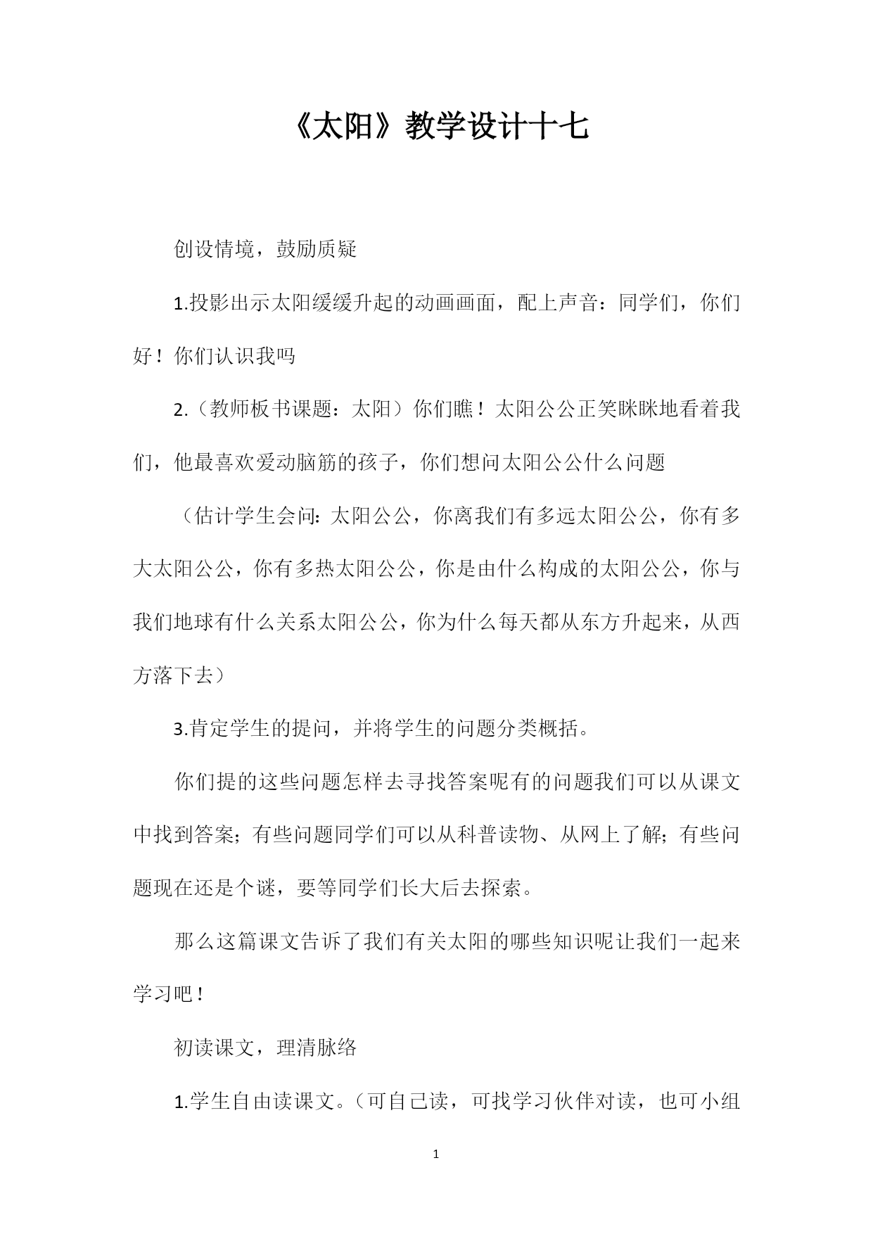 PAGEPAGE4《太阳》教学设计十七创设情境,鼓励质疑1.投影出示太阳缓缓升起的动画画面,配上声音:同学们,你们好!你们认识我吗2.(教师板书课题:太阳)你们瞧!太阳公公正笑眯眯地看着我们,他最喜欢爱动脑筋的孩子,你们想问太阳公公什么问题(估计学生会问:太阳公公,你离我们有多远太阳公公,你有多大太阳公公,你有多热太阳公公,你是由什么构成的太阳公公,你与我们地球有什么关系太阳公公,你为什么每天都从东方升起来,从西方落下去)3.肯定学生的提问,并将学生的问题分类概括。你们提的这些问题怎样去寻找答