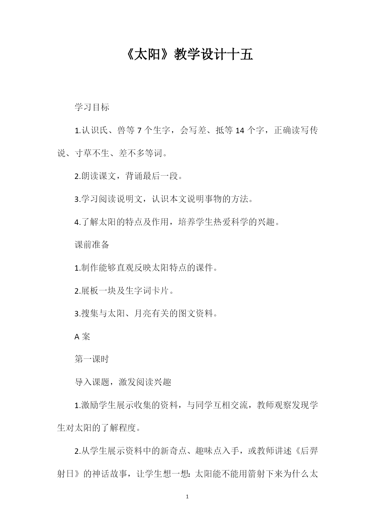 PAGEPAGE4《太阳》教学设计十五学习目标1.认识氏、兽等7个生字,会写差、抵等14个字,正确读写传说、寸草不生、差不多等词。2.朗读课文,背诵最后一段。3.学习阅读说明文,认识本文说明事物的方法。4.了解太阳的特点及作用,培养学生热爱科学的兴趣。课前准备1.制作能够直观反映太阳特点的课件。2.展板一块及生字词卡片。3.搜集与太阳、月亮有关的图文资料。A案第一课时导入课题,激发阅读兴趣1.激励学生展示收集的资料,与同学互相交流,教师观察发现学生对太阳的了解程度。2.从学生展示资料中的新奇点