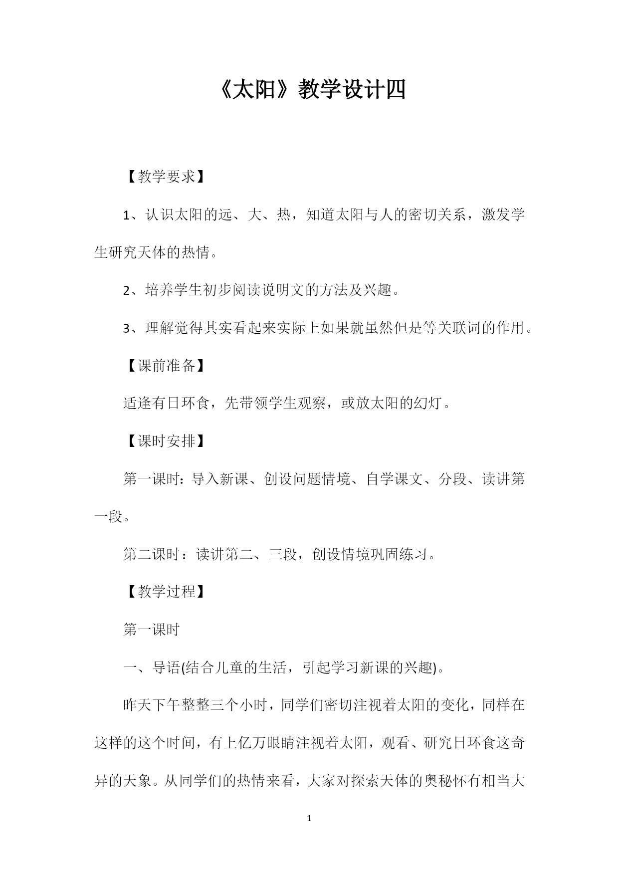PAGEPAGE6《太阳》教学设计四【教学要求】1、认识太阳的远、大、热,知道太阳与人的密切关系,激发学生研究天体的热情。2、培养学生初步阅读说明文的方法及兴趣。3、理解觉得其实看起来实际上如果就虽然但是等关联词的作用。【课前准备】适逢有日环食,先带领学生观察,或放太阳的幻灯。【课时安排】第一课时:导入新课、创设问题情境、自学课文、分段、读讲第一段。第二课时:读讲第二、三段,创设情境巩固练习。【教学过程】第一课时一、导语(结合儿童的生活,引起学习新课的兴趣)。昨天下午整整三个小时,同学们密切注