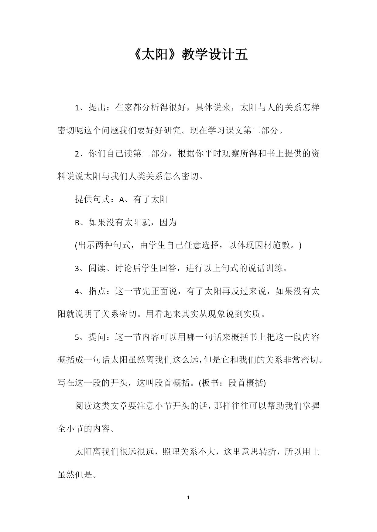 PAGEPAGE3《太阳》教学设计五1、提出:在家都分析得很好,具体说来,太阳与人的关系怎样密切呢这个问题我们要好好研究。现在学习课文第二部分。2、你们自己读第二部分,根据你平时观察所得和书上提供的资料说说太阳与我们人类关系怎么密切。提供句式:A、有了太阳B、如果没有太阳就,因为(出示两种句式,由学生自己任意选择,以体现因材施教。)3、阅读、讨论后学生回答,进行以上句式的说话训练。4、指点:这一节先正面说,有了太阳再反过来说,如果没有太阳就说明了关系密切。用看起来其实从现象说到实质。5、提问:
