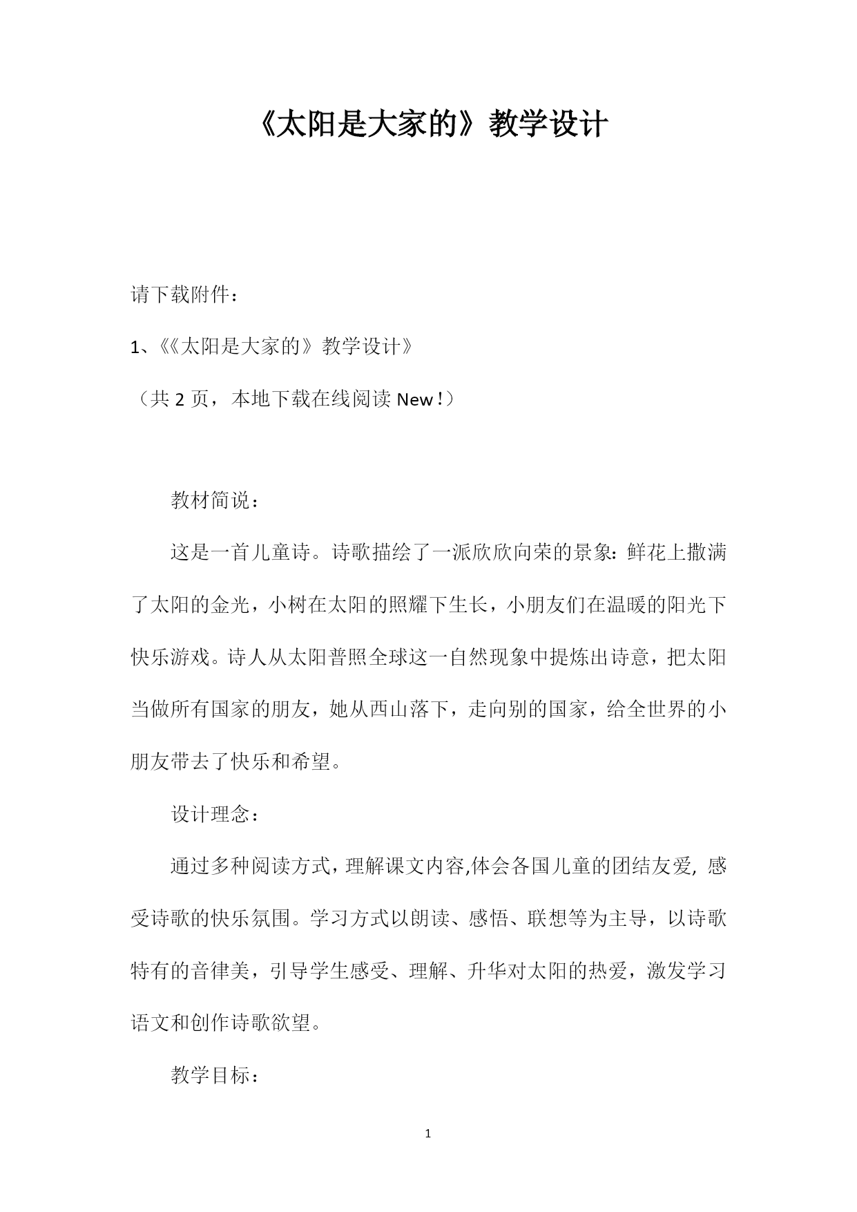 PAGEPAGE2《太阳是大家的》教学设计请下载附件:1、《《太阳是大家的》教学设计》(,本地下载在线阅读New!)教材简说:这是一首儿童诗。诗歌描绘了一派欣欣向荣的景象:鲜花上撒满了太阳的金光,小树在太阳的照耀下生长,小朋友们在温暖的阳光下快乐游戏。诗人从太阳普照全球这一自然现象中提炼出诗意,把太阳当做所有国家的朋友,她从西山落下,走向别的国家,给全世界的小朋友带去了快乐和希望。设计理念:通过多种阅读方式,理解课文内容,体会各国儿童的团结友爱,感受诗歌的快乐氛围。学习方式以朗读、感悟、联想等