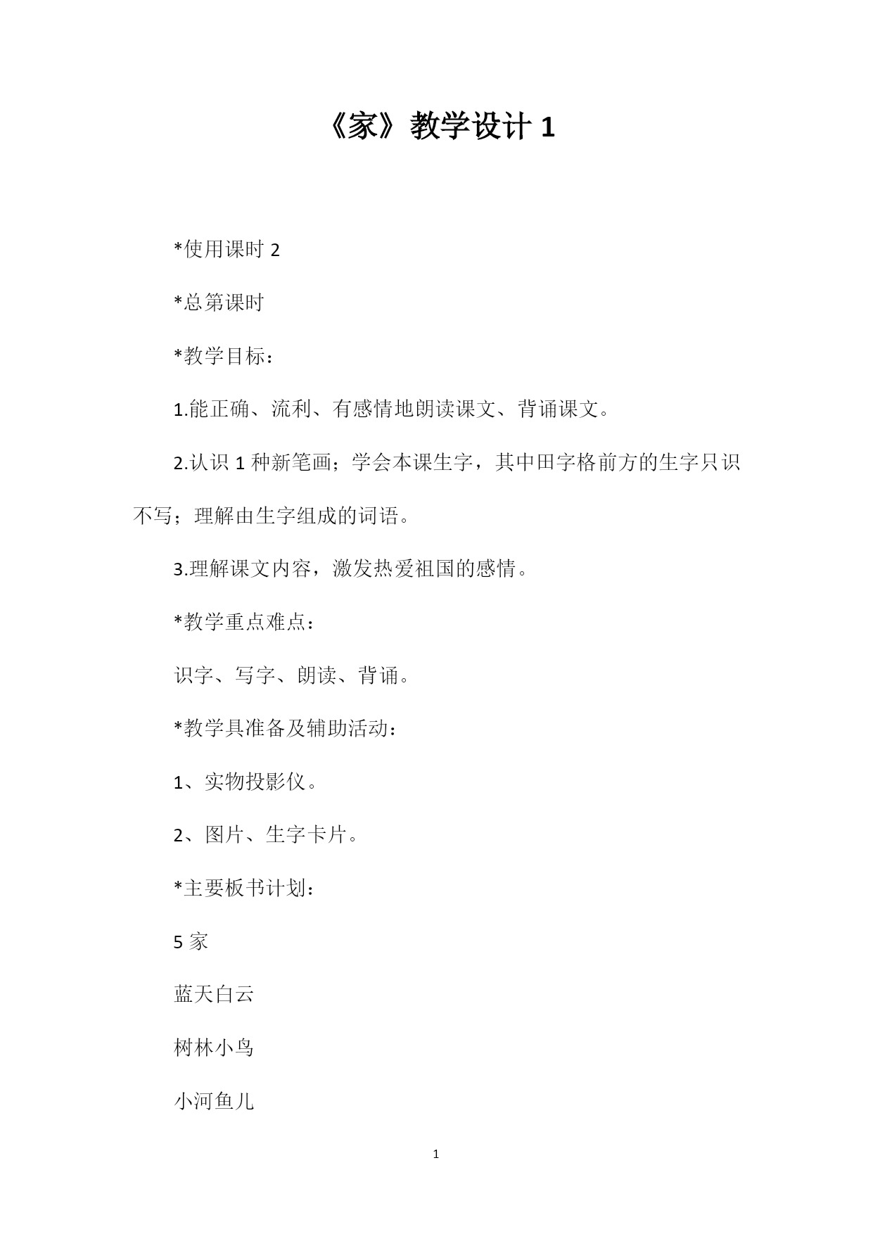 PAGEPAGE2《家》教学设计1*使用课时2*总第课时*教学目标:1.能正确、流利、有感情地朗读课文、背诵课文。2.认识1种新笔画;学会本课生字,其中田字格前方的生字只识不写;理解由生字组成的词语。3.理解课文内容,激发热爱祖国的感情。*教学重点难点:识字、写字、朗读、背诵。*教学具准备及辅助活动:1、实物投影仪。2、图片、生字卡片。*主要板书计划:5家蓝天白云树林小鸟小河鱼儿泥土种子祖国我们*作业设计安排:课内:描红、临写。课外:朗读、背诵。
