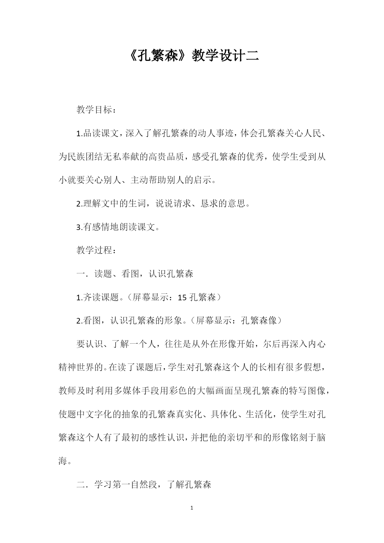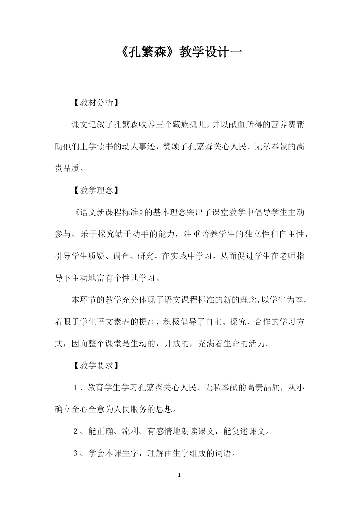 PAGEPAGE3《孔繁森》教学设计1教学要求:1、能正确、流利、有感情地朗读课文。能复述课文。2、教育学生学习孔繁森关心人民、为民族团结无私奉献的高贵品质,从小确立关心别人、主动帮助别人的思想。教学重、难点:从课文的语句中体会孔繁森的优秀品质。教前准备:组织看电影《孔繁森》或了解孔繁森的事迹。教学过程:第一课时一、揭示课题1、板书课题:15孔繁森2、简介孔繁森的事迹。二、初读课文1、自由练读课文。要求:一读,画出生字词,圈出生字。二读,画出长句子,读通读顺。三读,标出自然段序号。2、指名分自