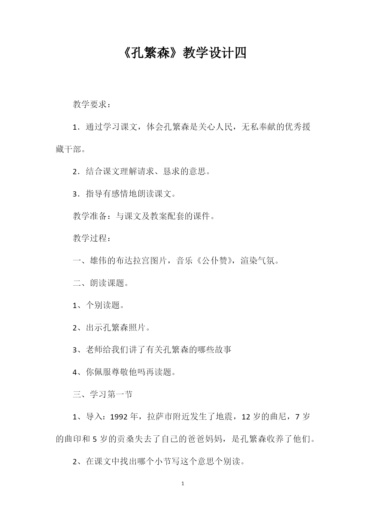 PAGEPAGE6《孔繁森》教学设计四教学要求:1.通过学习课文,体会孔繁森是关心人民,无私奉献的优秀援藏干部。2.结合课文理解请求、恳求的意思。3.指导有感情地朗读课文。教学准备:与课文及教案配套的课件。教学过程:一、雄伟的布达拉宫图片,音乐《公仆赞》,渲染气氛。二、朗读课题。1、个别读题。2、出示孔繁森照片。3、老师给我们讲了有关孔繁森的哪些故事4、你佩服尊敬他吗再读题。三、学习第一节1、导入:1992年,拉萨市附近发生了地震,12岁的曲尼,7岁的曲印和5岁的贡桑失去了自己的爸爸妈妈,是孔