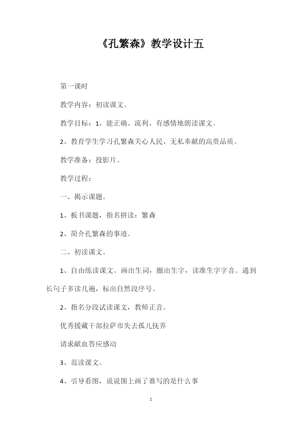 PAGEPAGE6《孔繁森》教学设计五第一课时教学内容:初读课文。教学目标:1、能正确、流利、有感情地朗读课文。2、教育学生学习孔繁森关心人民、无私奉献的高贵品质。教学准备:投影片。教学过程:一、揭示课题。1、板书课题,指名拼读:繁森2、简介孔繁森的事迹。二、初读课文。1、自由练读课文。画出生词,圈出生字,读准生字字音。遇到长句子多读几遍,标出自然段序号。2、指名分段试读课文,教师正音。优秀援藏干部拉萨市失去孤儿抚养请求献血答应感动3、范读课文。4、引导看图,说说图上画了谁写的是什么事三、作业