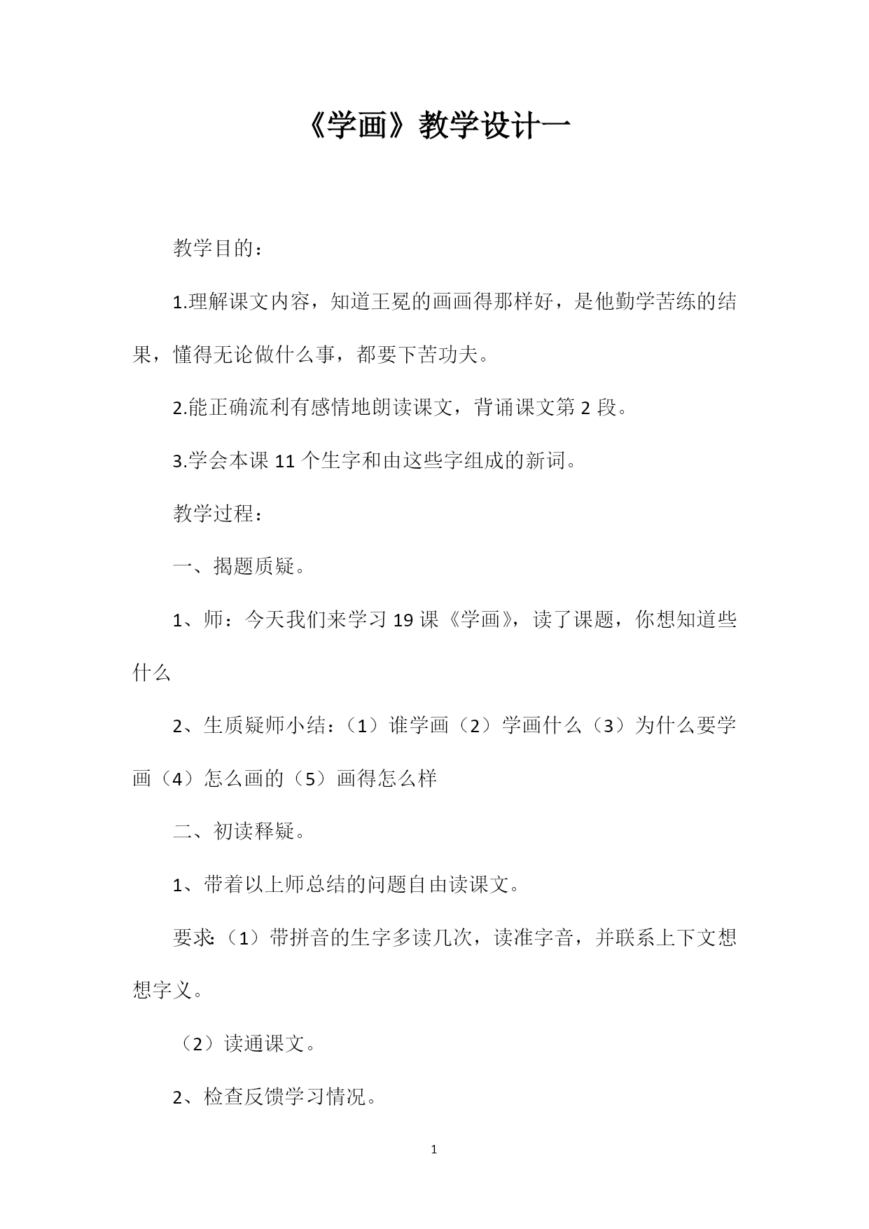 PAGEPAGE4《学画》教学设计一教学目的:1.理解课文内容,知道王冕的画画得那样好,是他勤学苦练的结果,懂得无论做什么事,都要下苦功夫。2.能正确流利有感情地朗读课文,背诵课文第2段。3.学会本课11个生字和由这些字组成的新词。教学过程:一、揭题质疑。1、师:今天我们来学习19课《学画》,读了课题,你想知道些什么2、生质疑师小结:(1)谁学画(2)学画什么(3)为什么要学画(4)怎么画的(5)画得怎么样二、初读释疑。1、带着以上师总结的问题自由读课文。要求:(1)带拼音的生字多读几次,读准